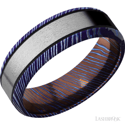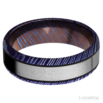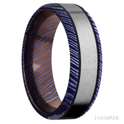 7 mm wide/Beveled/Titanium Damascus band with one 4 mm Centered inlay of Titanium.