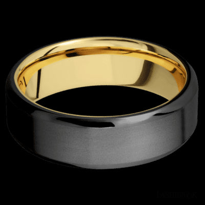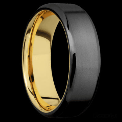 7 mm wide Beveled Zirconium band featuring a 14K Yellow Gold sleeve.