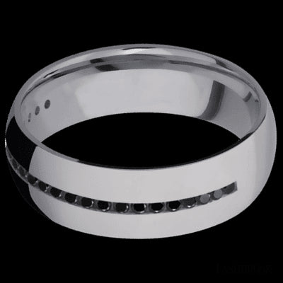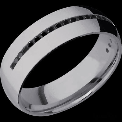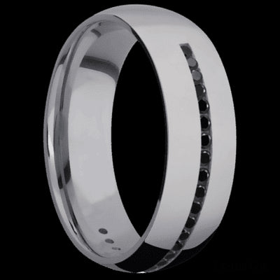 7 mm wide/Domed/Tantalum band with a Half Eternity arrangement of .015 carat Round Black Diamond stones in a Channel setting.