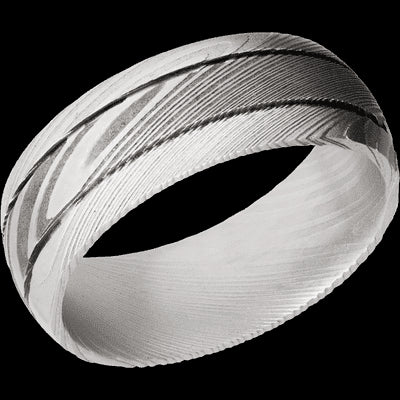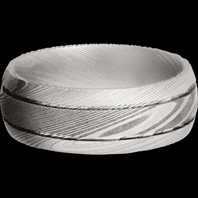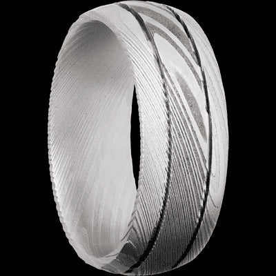 8 mm wide Domed with two accent grooves Damascus band.