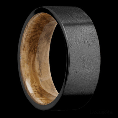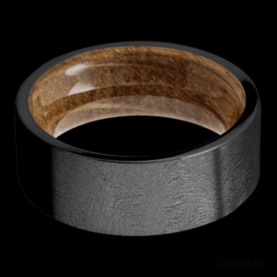 8 mm wide Flat Zirconium band featuring a Whiskey Barrel sleeve.