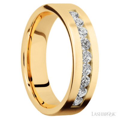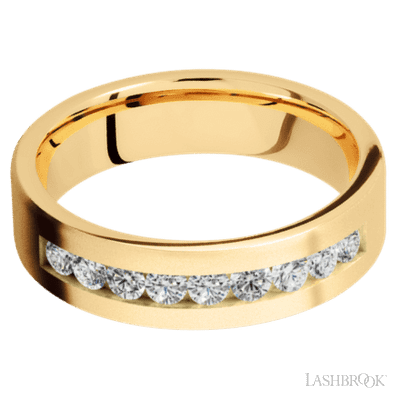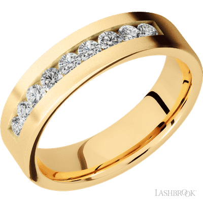 6 mm wide/Flat/14K Yellow Gold band with an arrangement of 9, .07 carat Round Diamond stones in a Channel setting.