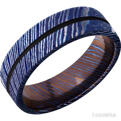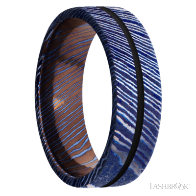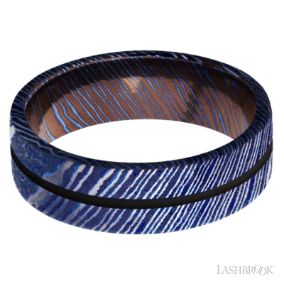 7 mm wide/Flat/Titanium Damascus band with one 1 mm Centered inlay of Black.