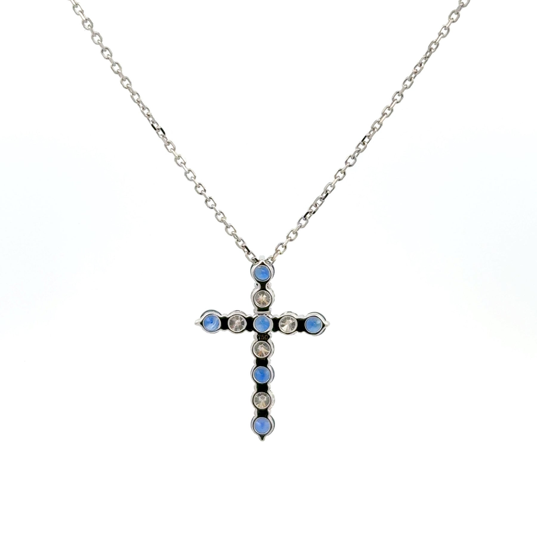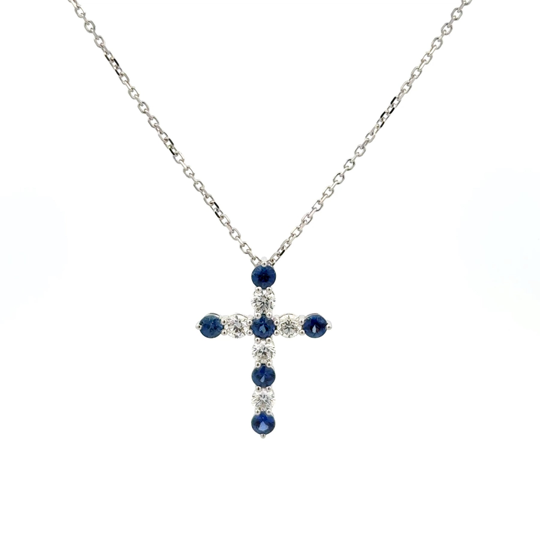 Adorn your neckline with this exquisite white gold charm necklace, showcasing a delicate cross pendant. The pendant is meticulously set with round-cut sapphires exhibiting a captivating royal blue hue. These sapphires are arranged in a brilliant cutting style, adding a touch of sophistication and vibrant color to this timeless piece. A perfect blend of elegance and charm. 1.07 total weight round sapphire 18 karat white gold 0.73 total diamond weight