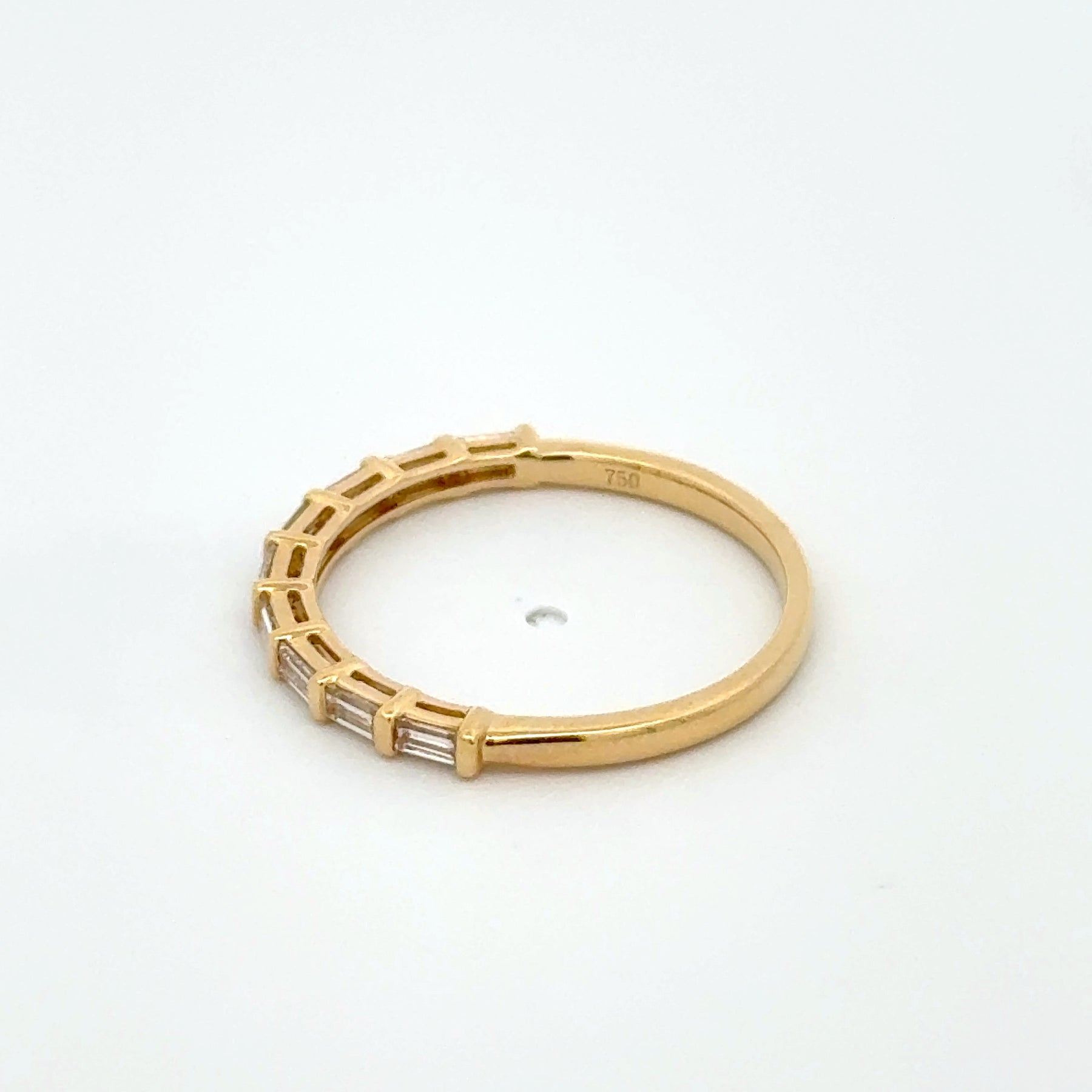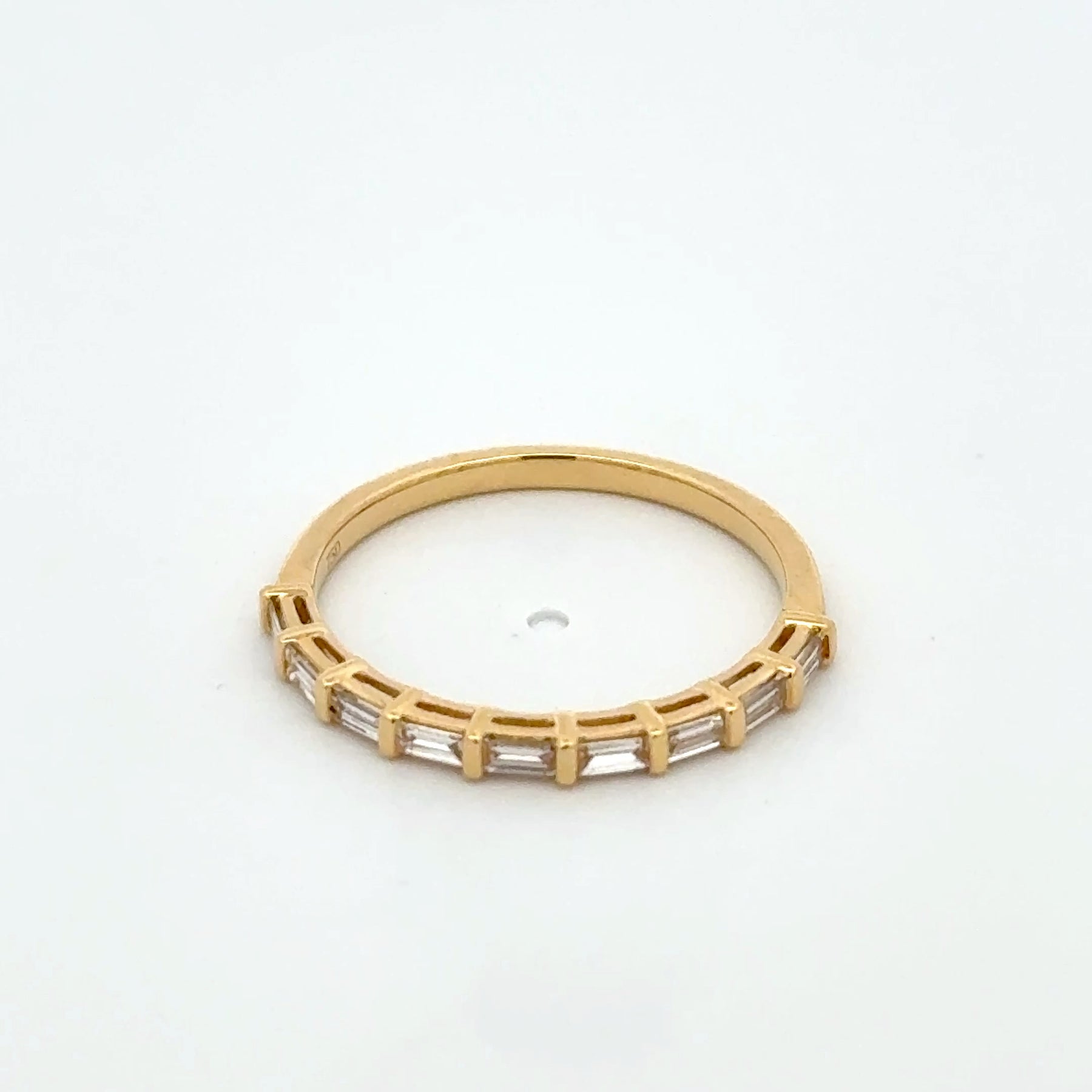 Exquisite yellow gold eternity ring featuring a seamless row of meticulously cut baguette diamonds. The step cut enhances the diamonds' natural brilliance, creating a captivating and sophisticated design. This timeless piece is perfect for celebrating enduring love and commitment. 0.27 total weight baguette diamond 18 karat yellow gold 0.27 total diamond weight