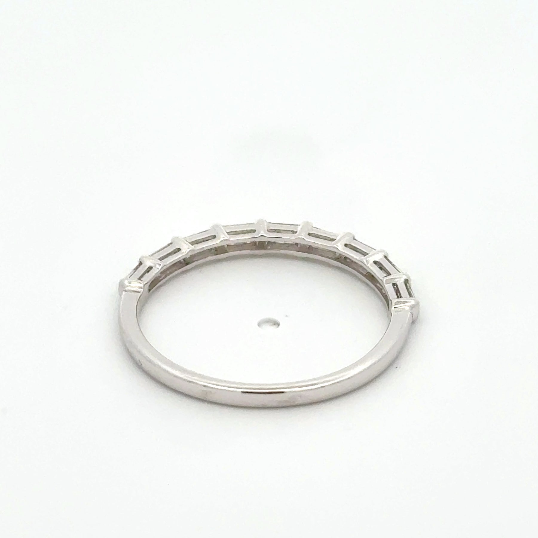 Exquisitely crafted in fine white gold, this ring features a seamless row of expertly step-cut baguette diamonds. The diamonds are meticulously set to ensure continuous brilliance and a sleek, sophisticated aesthetic. An elegant symbol of everlasting commitment. 0.27 total weight baguette diamond 18 karat white gold 0.27 total diamond weight