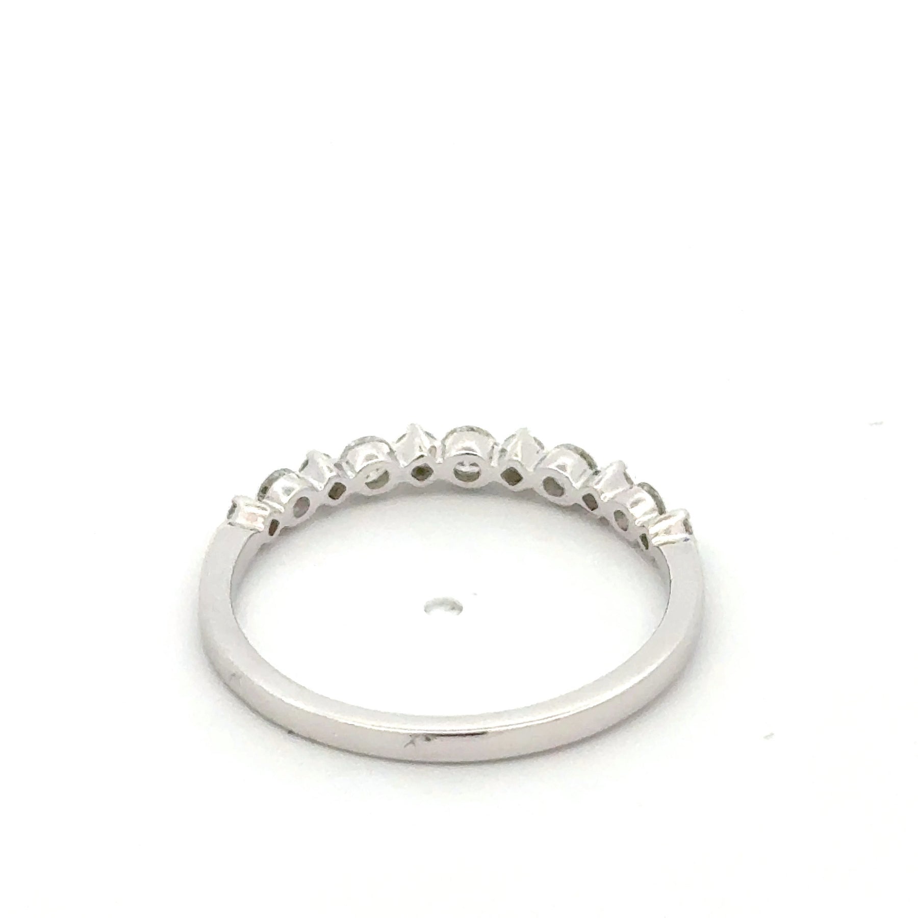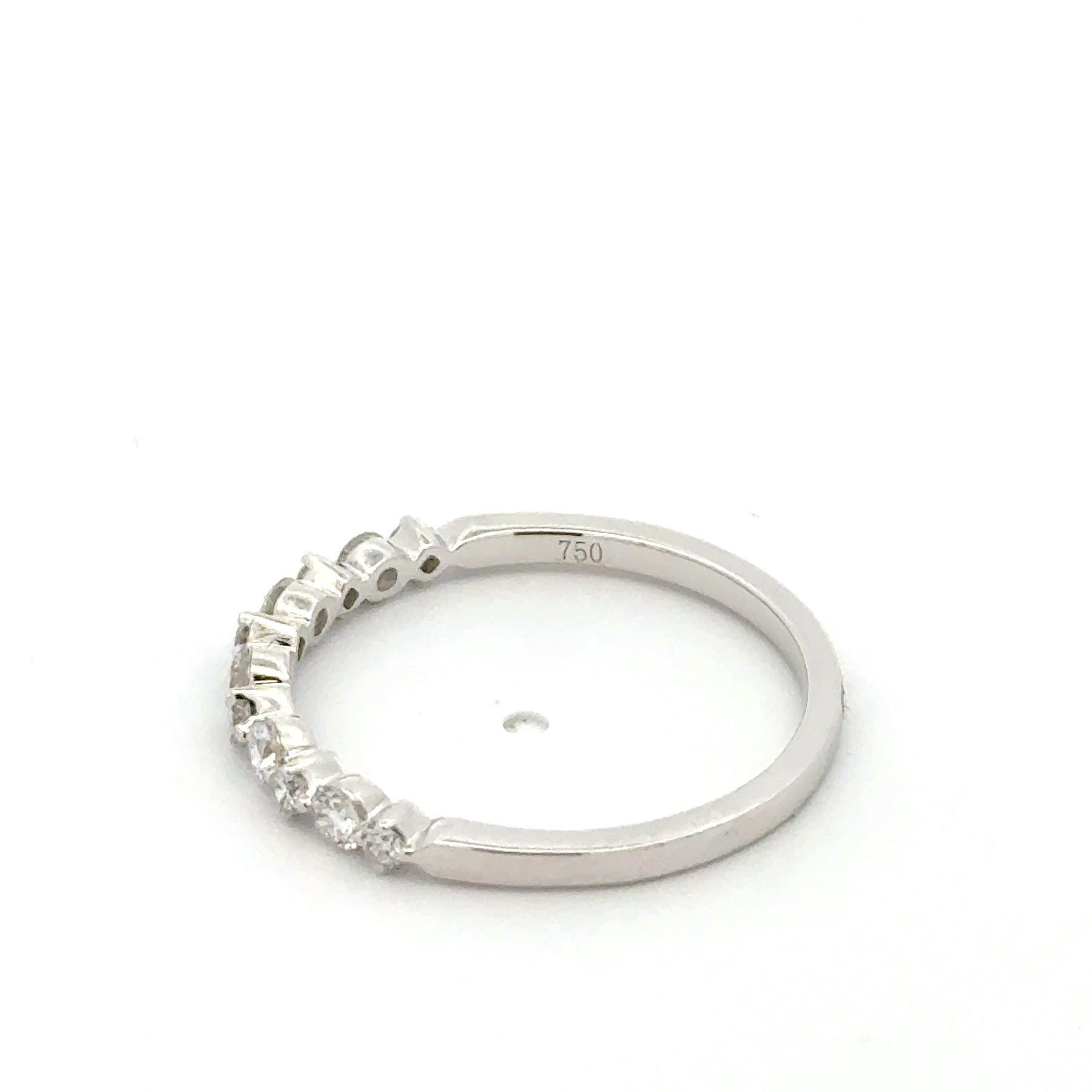 Elegantly crafted in white gold, this ring showcases a continuous row of brilliant cut diamonds. The round shape of each diamond maximizes its sparkle and fire. A timeless design, this ring symbolizes everlasting love and commitment, perfect for any occasion. 0.35 total weight round Diamond 18 karat white gold 0.35 total diamond weight