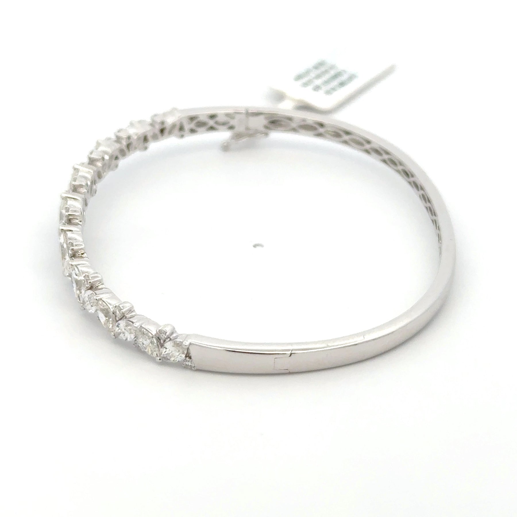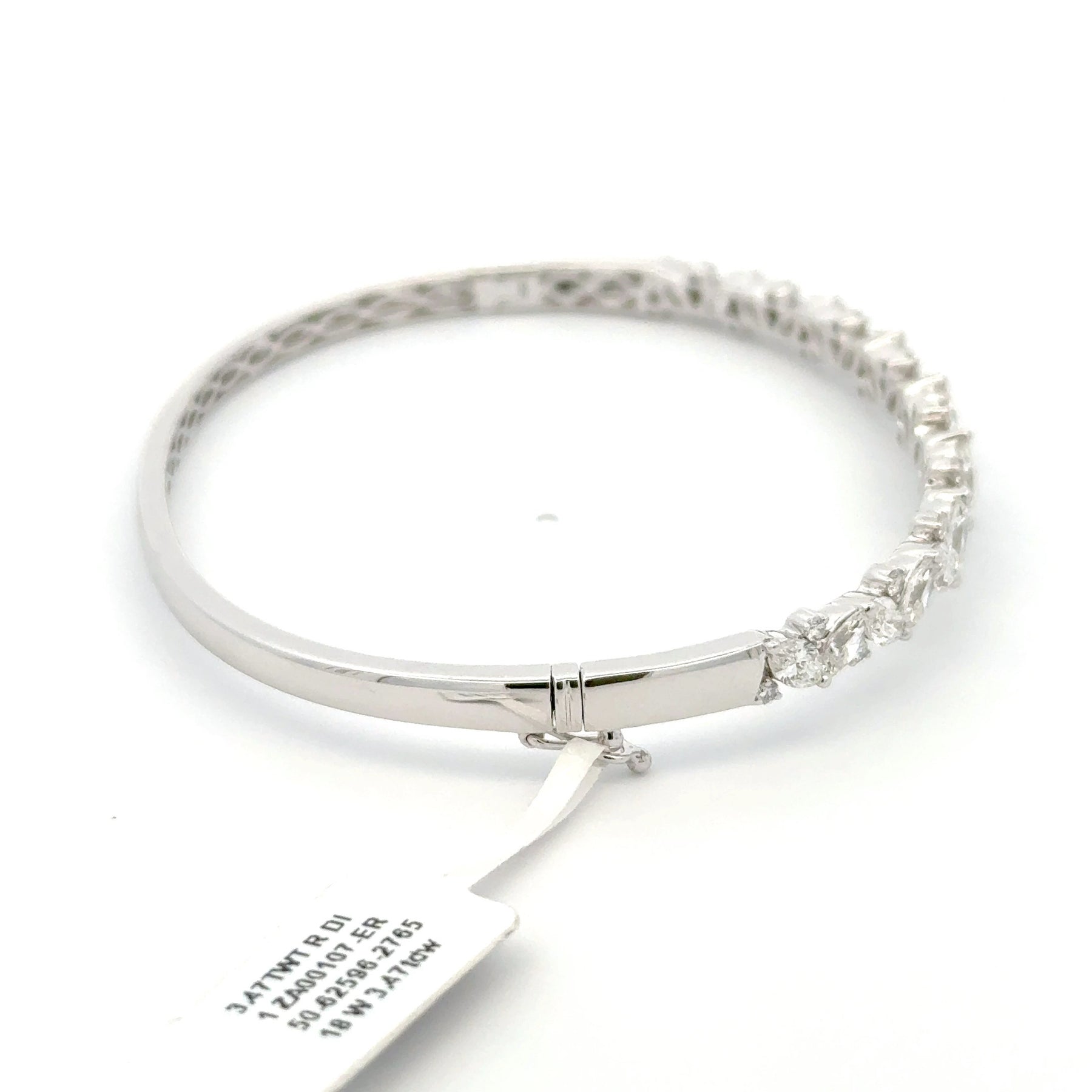 Exquisite bangle crafted in lustrous white gold, featuring a delicate series of marquise-cut diamonds. These diamonds are masterfully cut in mixed styles to amplify their natural brilliance and sparkle. This elegant design seamlessly combines classic sophistication with modern flair, making it a timeless addition to any jewelry collection. 3.47 total weight round Diamond 18 karat white gold 3.47 total diamond weight