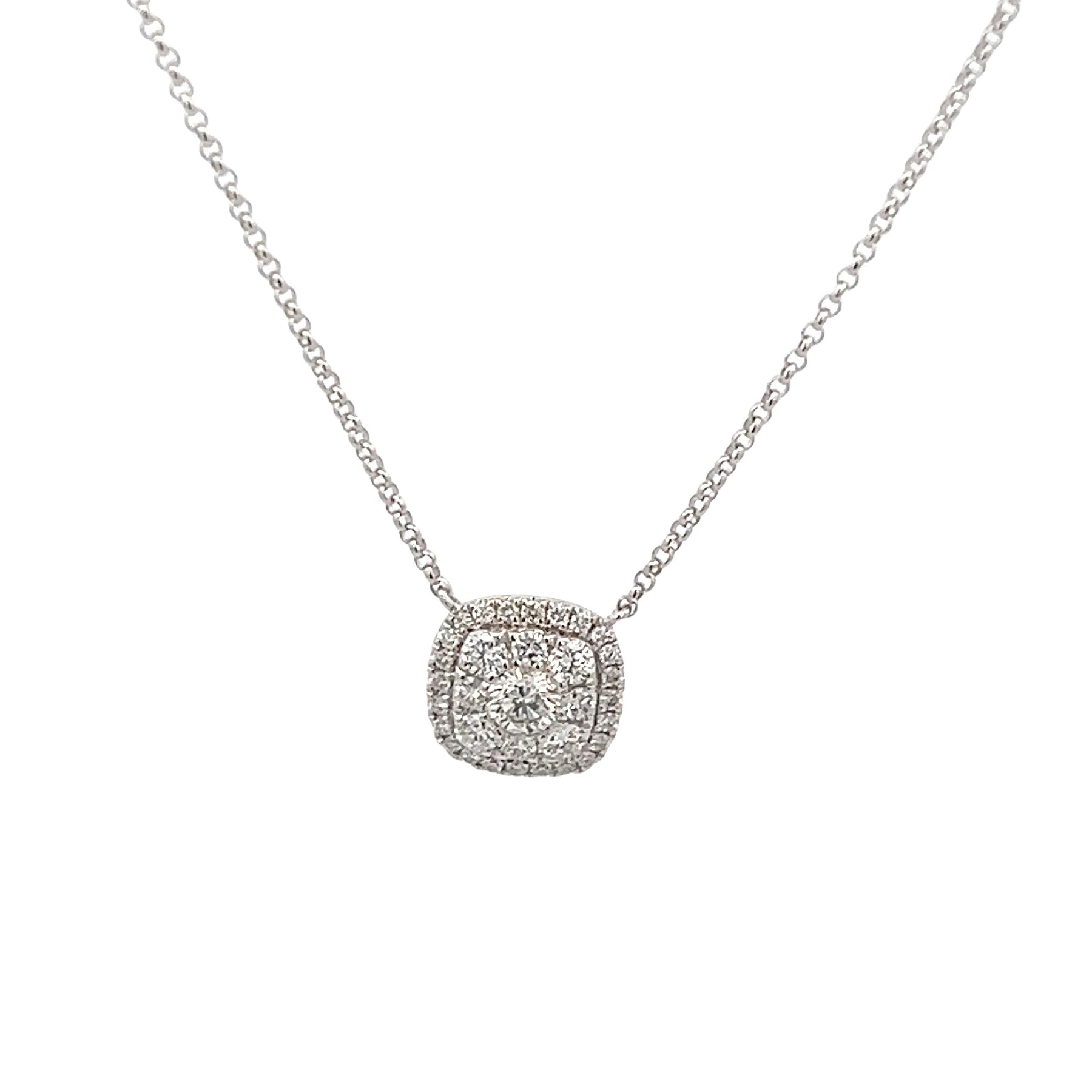 This stunning diamond pendant necklace features a beautifully crafted design that captures the light with every movement. The intricate detailing around the central diamond adds a touch of sophistication, making it the perfect accessory for any occasion. 0.51 total weight Round diamond. 18 karat white gold 0.51 total diamond weight.