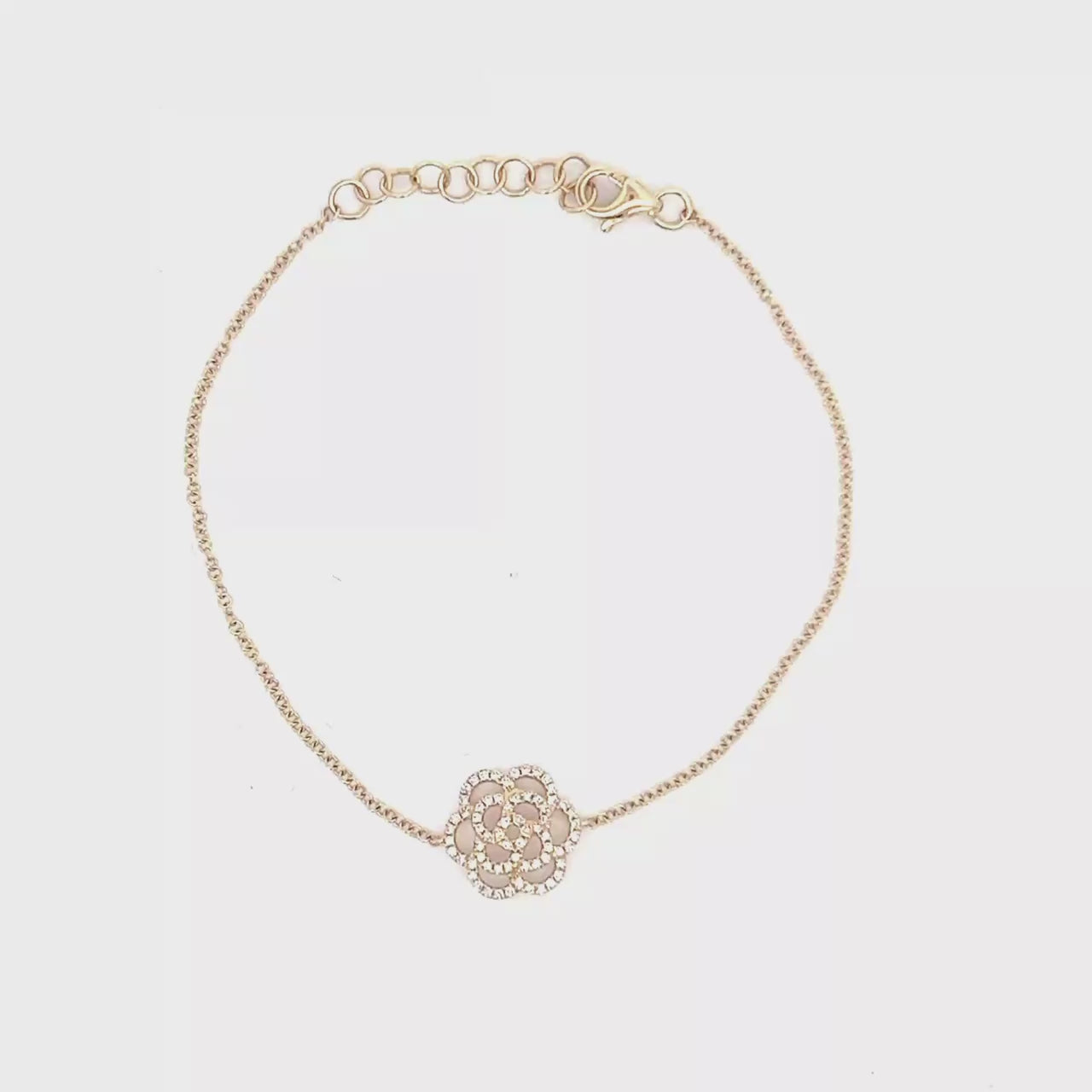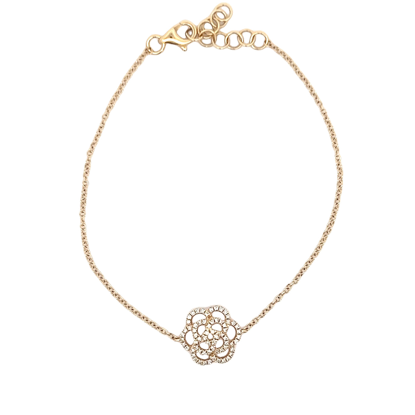 This exquisite floral gold bracelet features a delicate design that captures the essence of elegance. Adorned with sparkling accents, it adds a touch of sophistication to any outfit, making it perfect for both casual and formal occasions. 0.14 total weight round diamond. 14 karat yellow gold 0.14 total diamond weight.