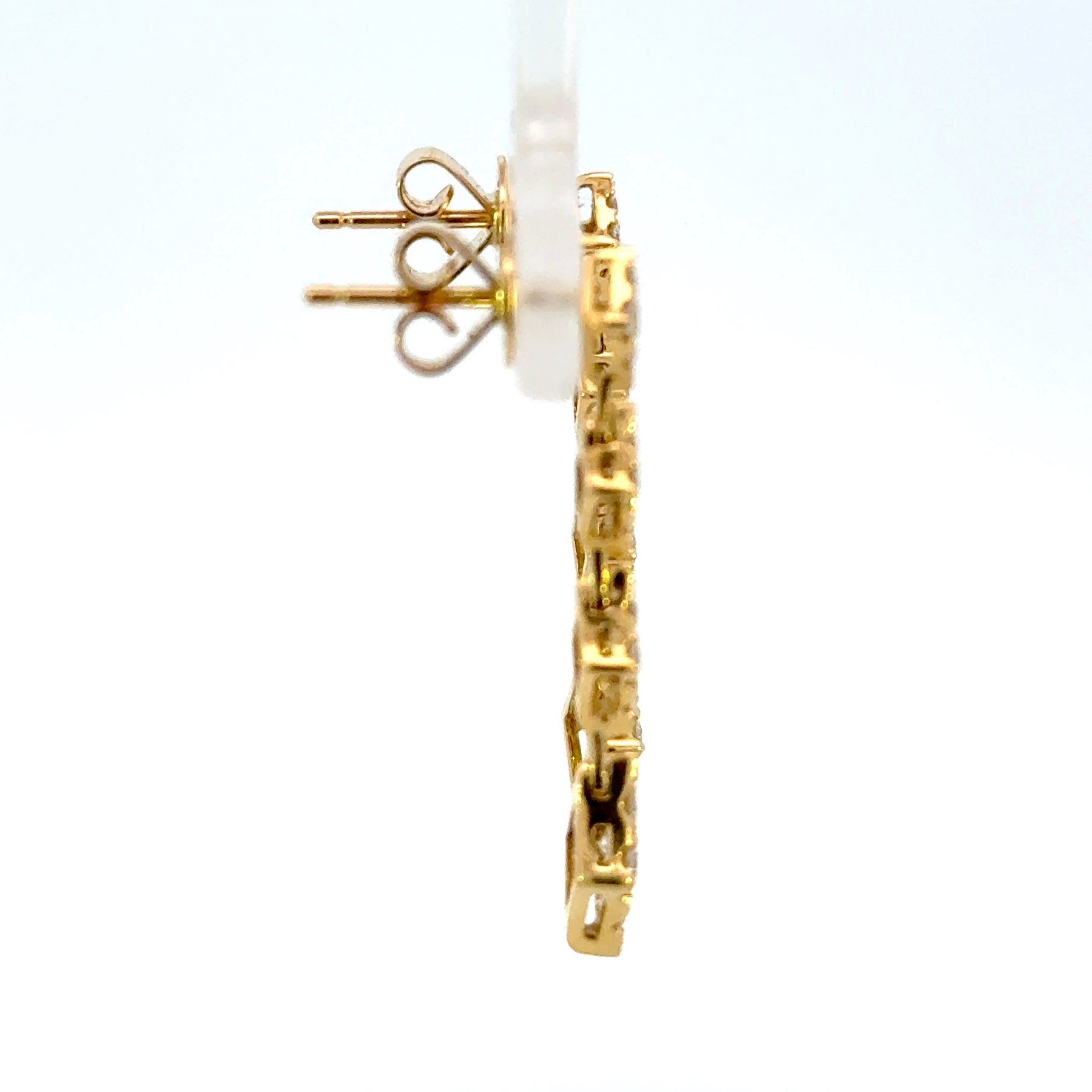 These exquisite dangle earrings feature a cascade of geometrically-shaped segments in radiant yellow gold. Each segment is adorned with a cluster of brilliant cut diamonds, adding a touch of sparkle. The articulated design allows for graceful movement, making these earrings a sophisticated accessory for any occasion. 32-0-65 total weight round Diamond 18 karat yellow gold 0.65 total diamond weight