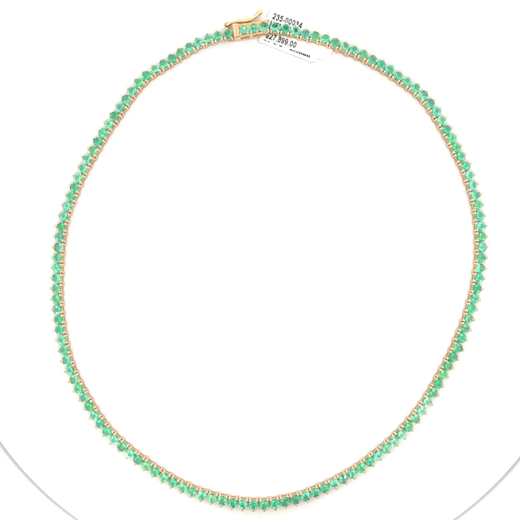 Elevate your elegance with this exquisite gold chain necklace featuring a continuous strand of round brilliant-cut emeralds. The vibrant green gemstones are meticulously set, creating a mesmerizing display of color and brilliance. This necklace is a timeless piece, perfect for adding a touch of sophistication to any ensemble. 15.27 total weight round Emerald 14ky gold