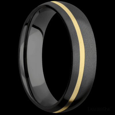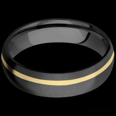 6 mm wide/Domed/Zirconium band with one 1 mm Off Center inlay of 14K Yellow Gold.