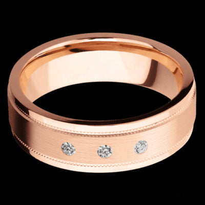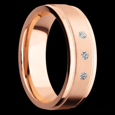 7 mm wide/Flat Stepped Edges Milgrain/14K Rose Gold band with an arrangement of 3, .03 carat Round Diamond stones in a Flush setting.