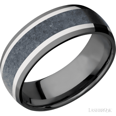 8 mm wide/Domed/Zirconium band featuring inlays of 14K White Gold and Blue Sapphire.