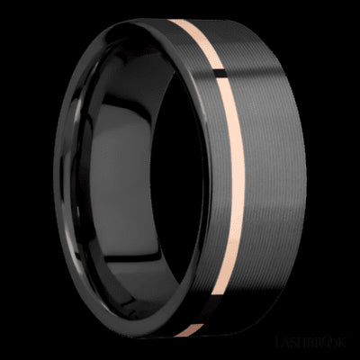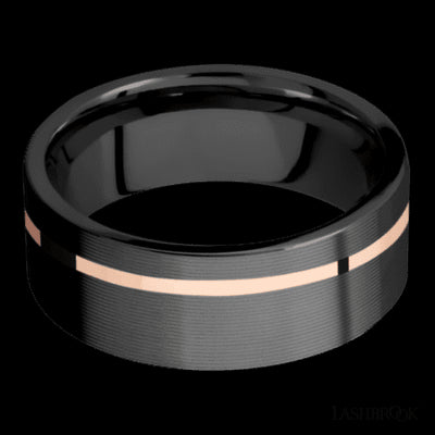 8 mm wide/Flat/Zirconium band with one 1 mm Off Center inlay of 14K Rose Gold.