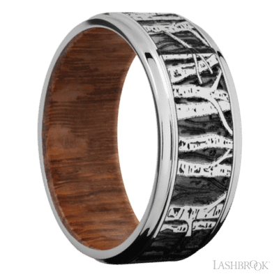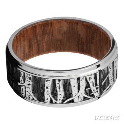 9 mm wide/Flat Grooved Edges/Cobalt Chrome band with a laser carved Aspen pattern also featuring a Leopard Wood sleeve.