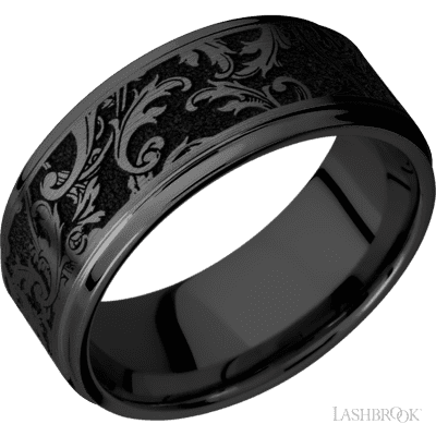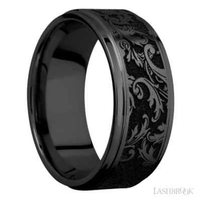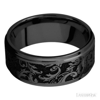 9 mm wide/Flat Grooved Edges/Zirconium band with a laser carved Black Leaf pattern.