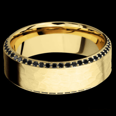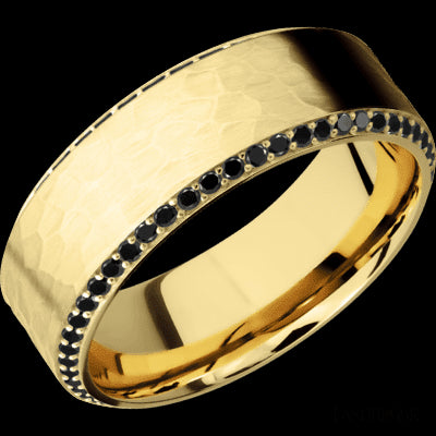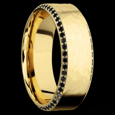 8 mm wide/High Bevel/14K Yellow Gold band with a Bevel Eternity arrangement of .01 carat Round Black Diamond stones in a Bead setting.