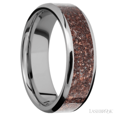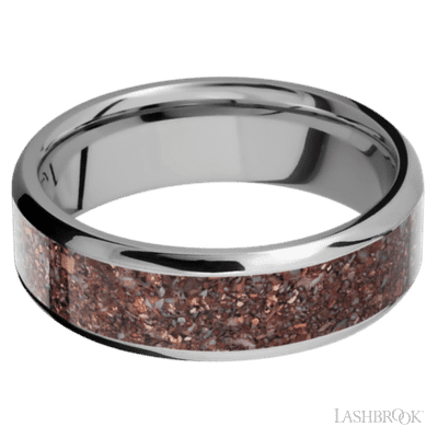7 mm wide/Beveled/Titanium band with one 5 mm Centered inlay of Dinosaur Bone Mixed.