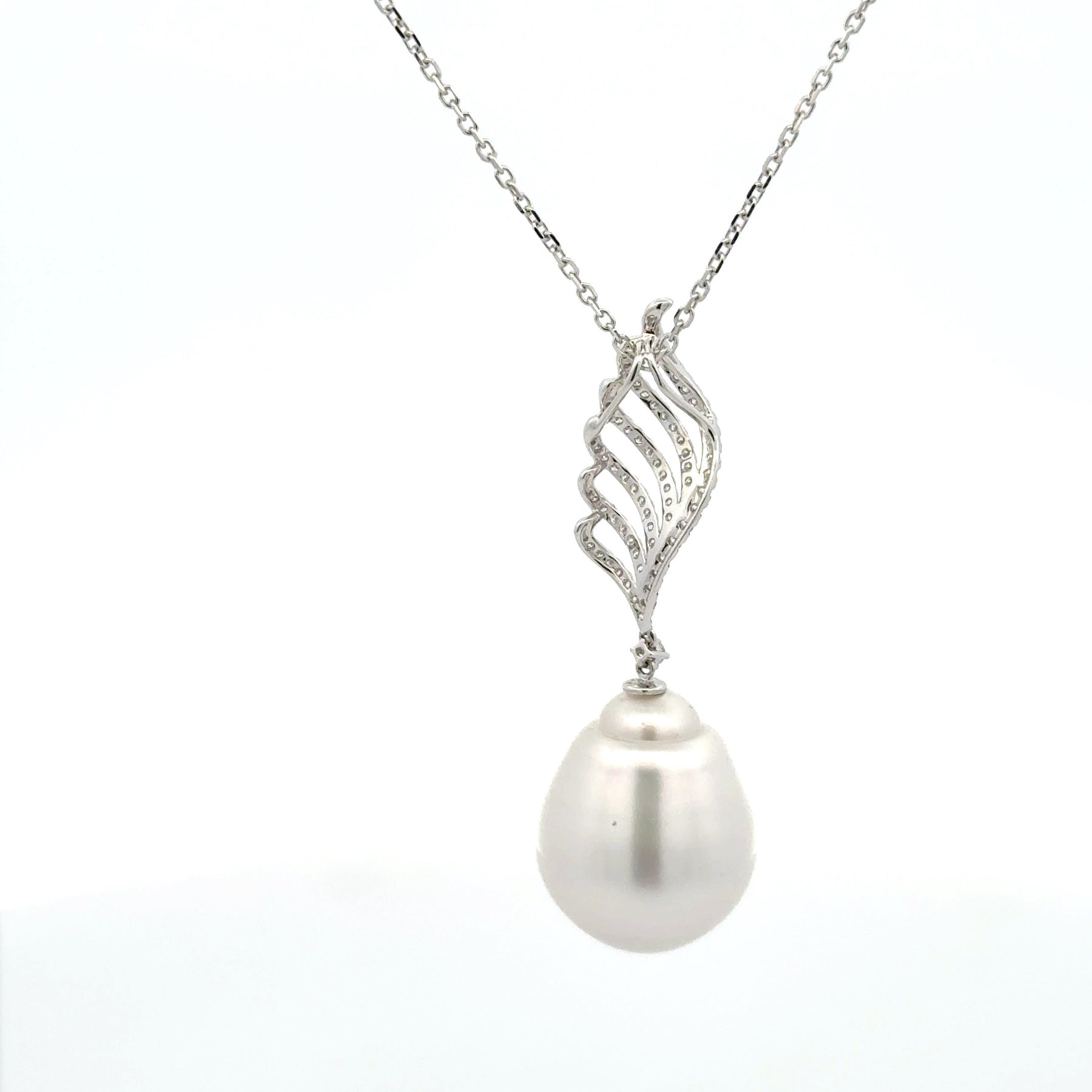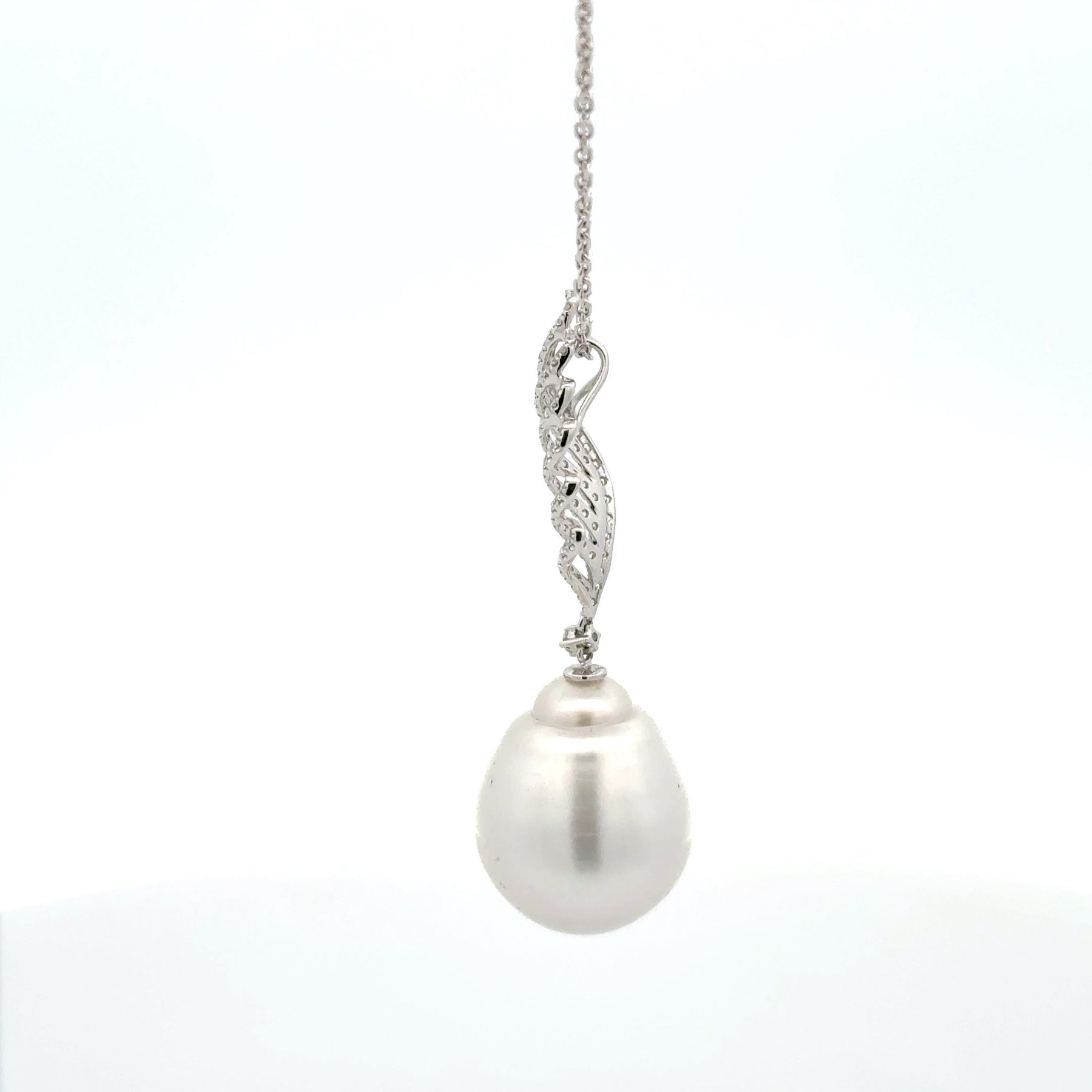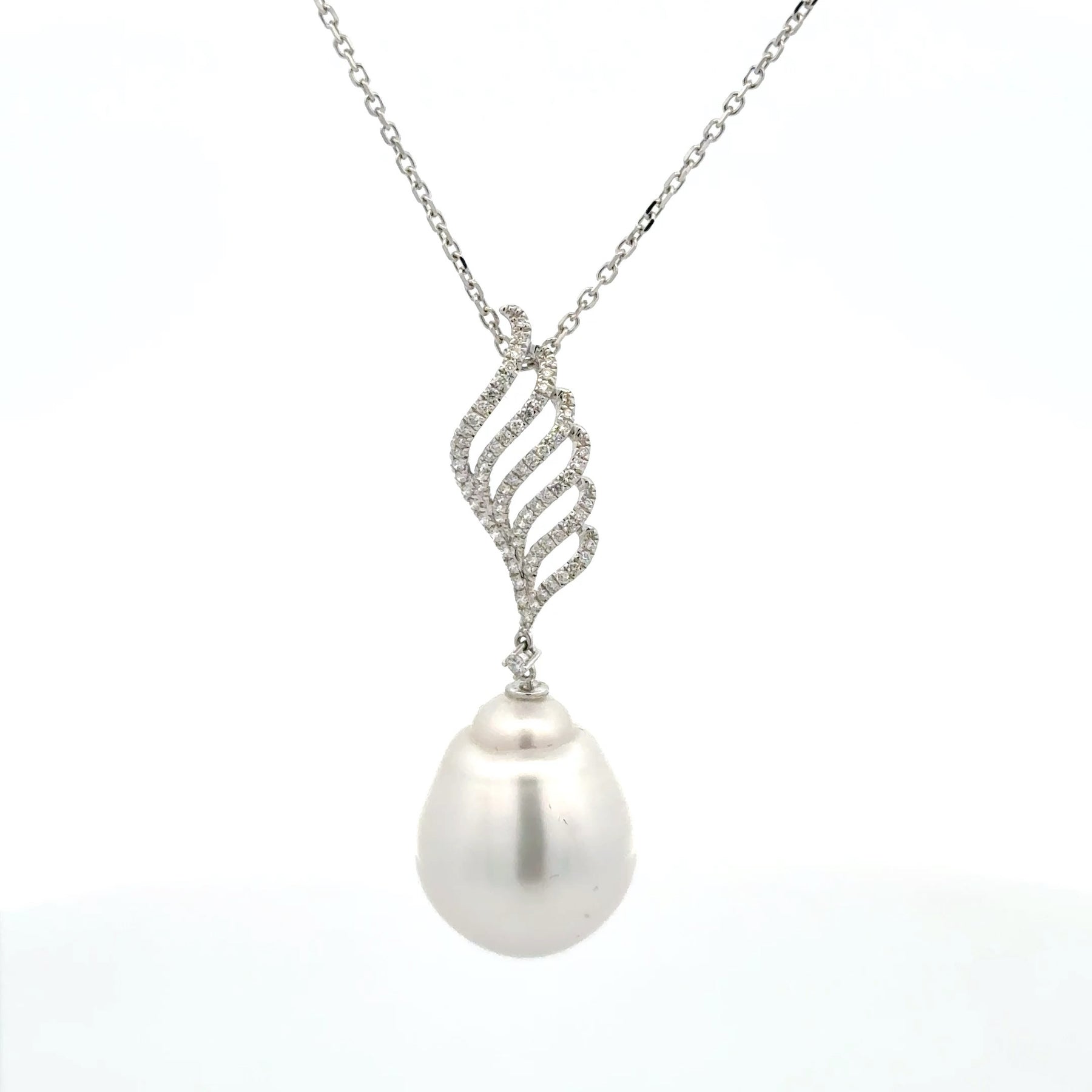 Elevate your style with this exquisite pearl necklace. A lustrous, pear-shaped pearl graces this elegant white gold necklace, suspended from a dazzling silver swirl pendant. Its luminous surface and classic silhouette offer a timeless addition to any jewelry collection, ideal for special occasions or adding a touch of sophistication to everyday wear. 18 karat white gold 0.36 total diamond weight
