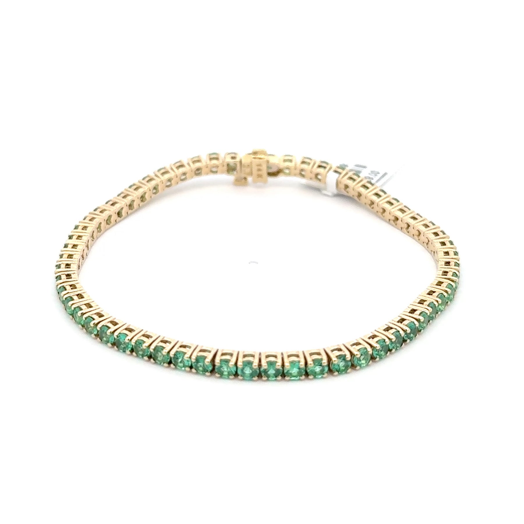 Indulge in the allure of this exquisite yellow gold tennis bracelet, meticulously adorned with round brilliant-cut emeralds. Each vibrant green gemstone showcases exceptional clarity, transparency, and good polish, creating a mesmerizing display of color and brilliance. A timeless treasure to elevate any ensemble. 4.71 total weight round emerald 14ky gold