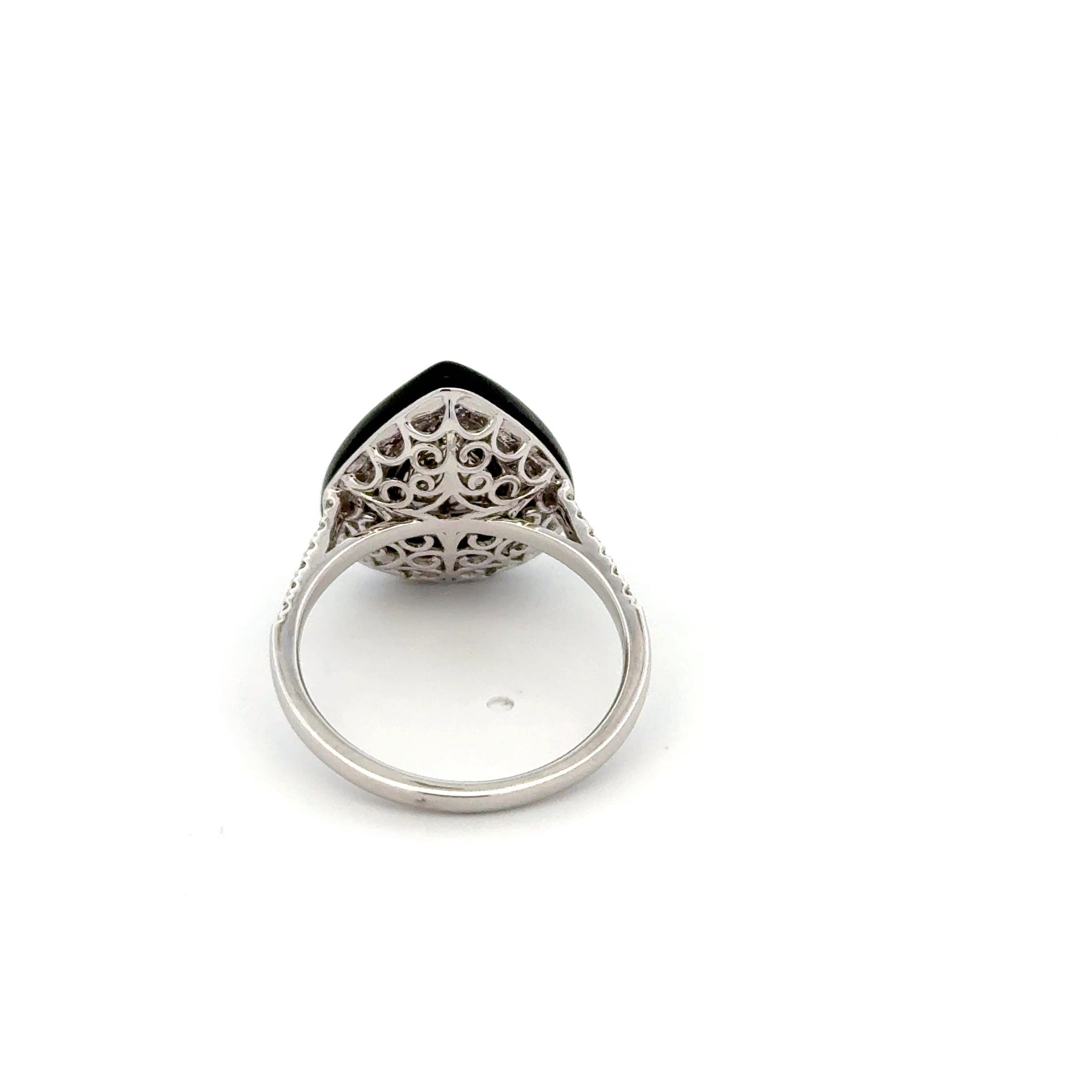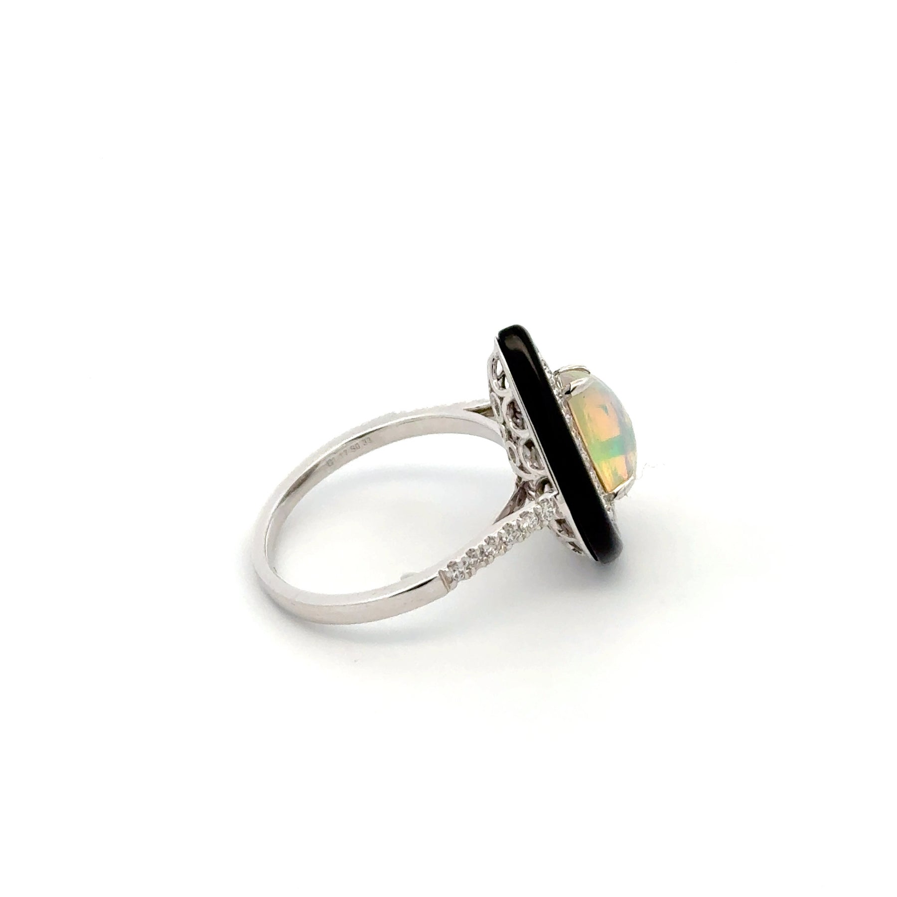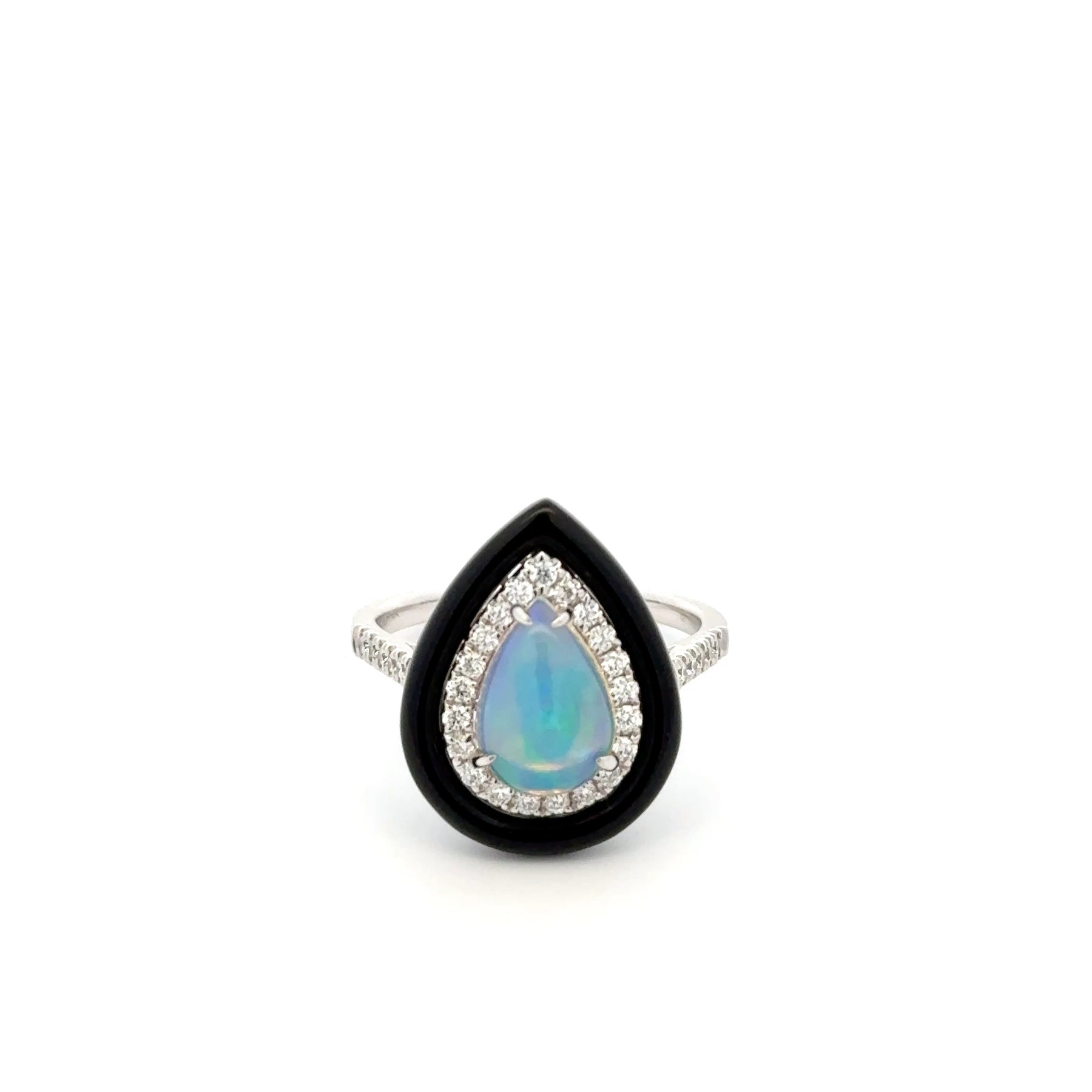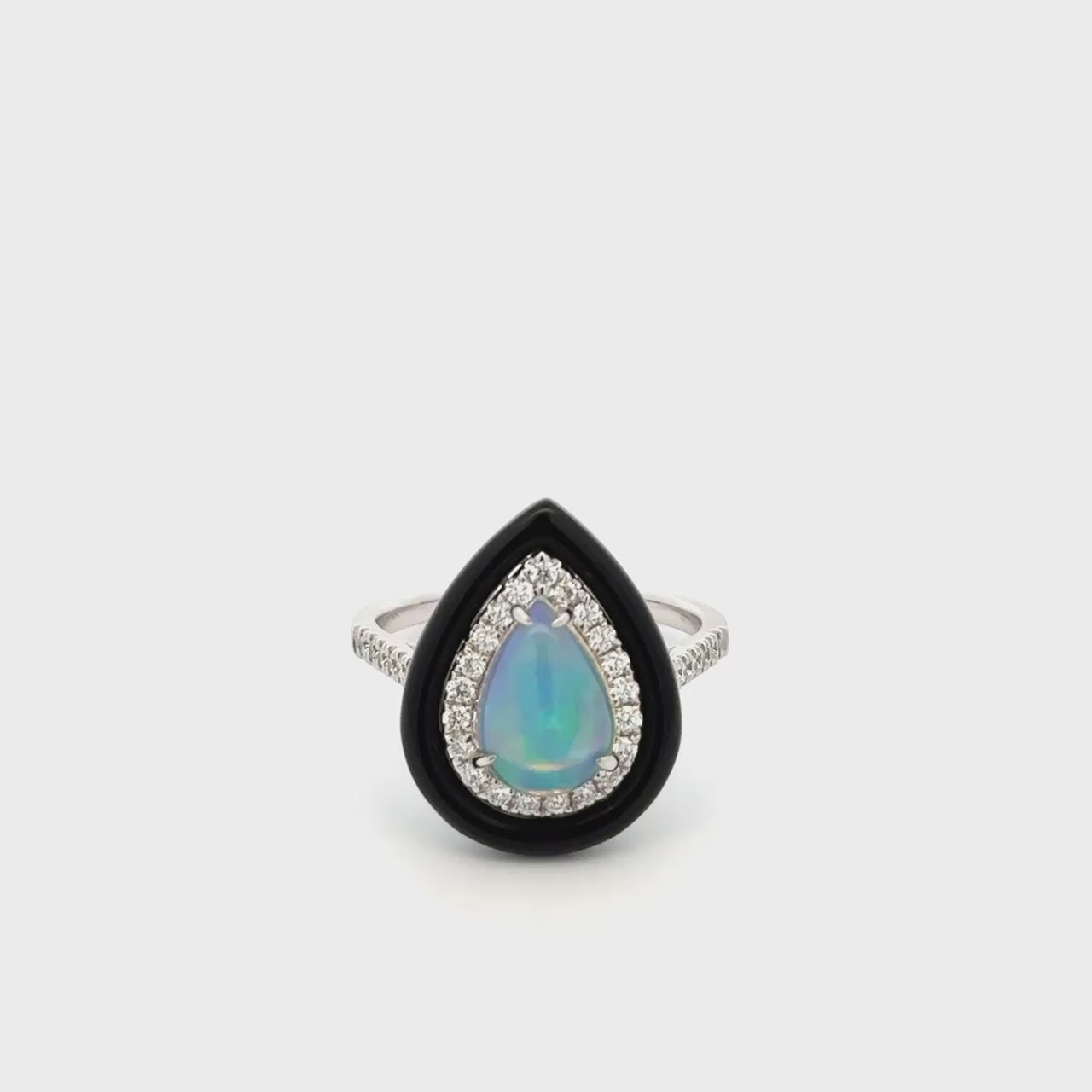 Elevate your style with this exquisite Pear shaped Opal ring, masterfully crafted in lustrous white gold . At its heart lies a captivating pear-shaped cabochon opal, displaying a mesmerizing play of blue iridescence. This striking ring embodies sophistication and unique charm. 1.50 total diamond weight 14 karat white gold