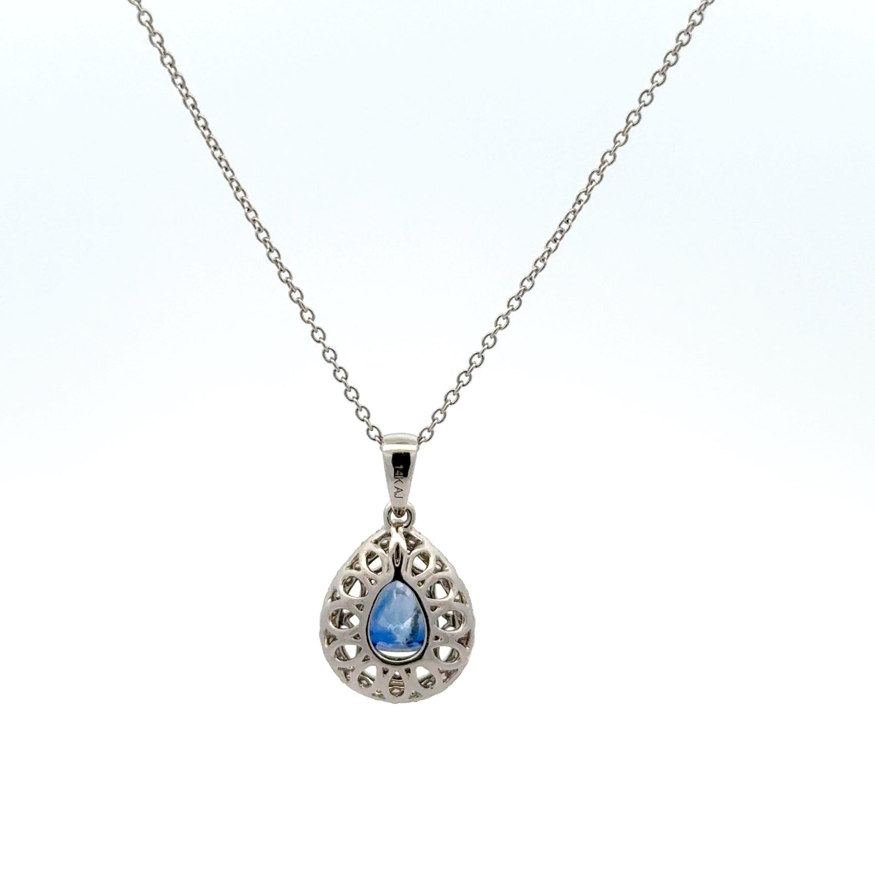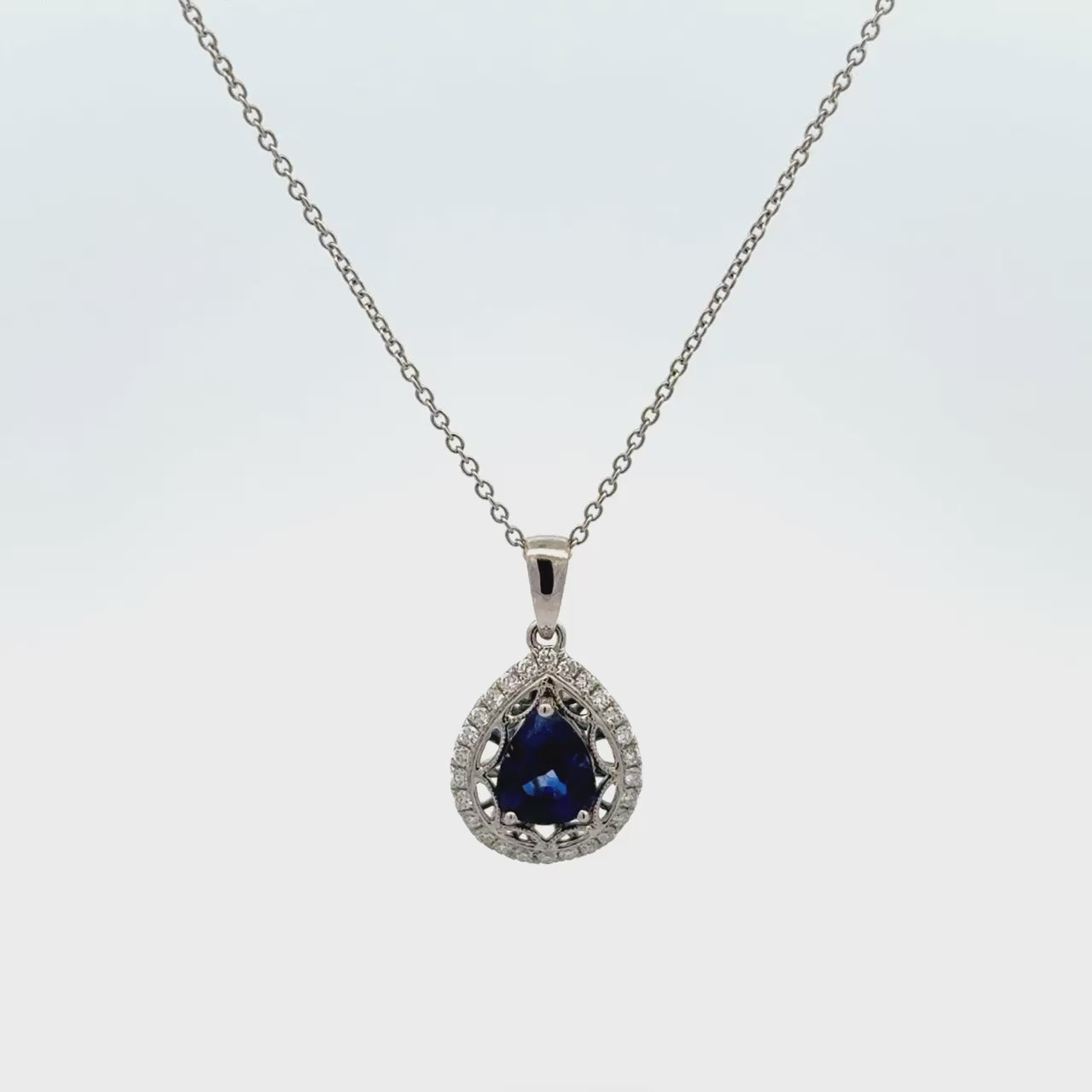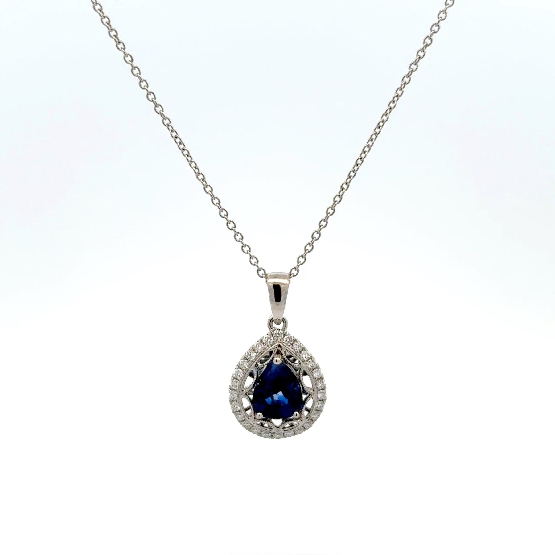 Exquisite Pendant necklace featuring a pear-shaped, brilliant-cut sapphire. Set in lustrous white gold, the royal blue sapphire exhibits a deep, saturated hue. This elegant piece is perfect for adding a touch of sophisticated color to any ensemble. 1.52 total weight pear sapphire 14 karat white 0.21 total diamond weight
