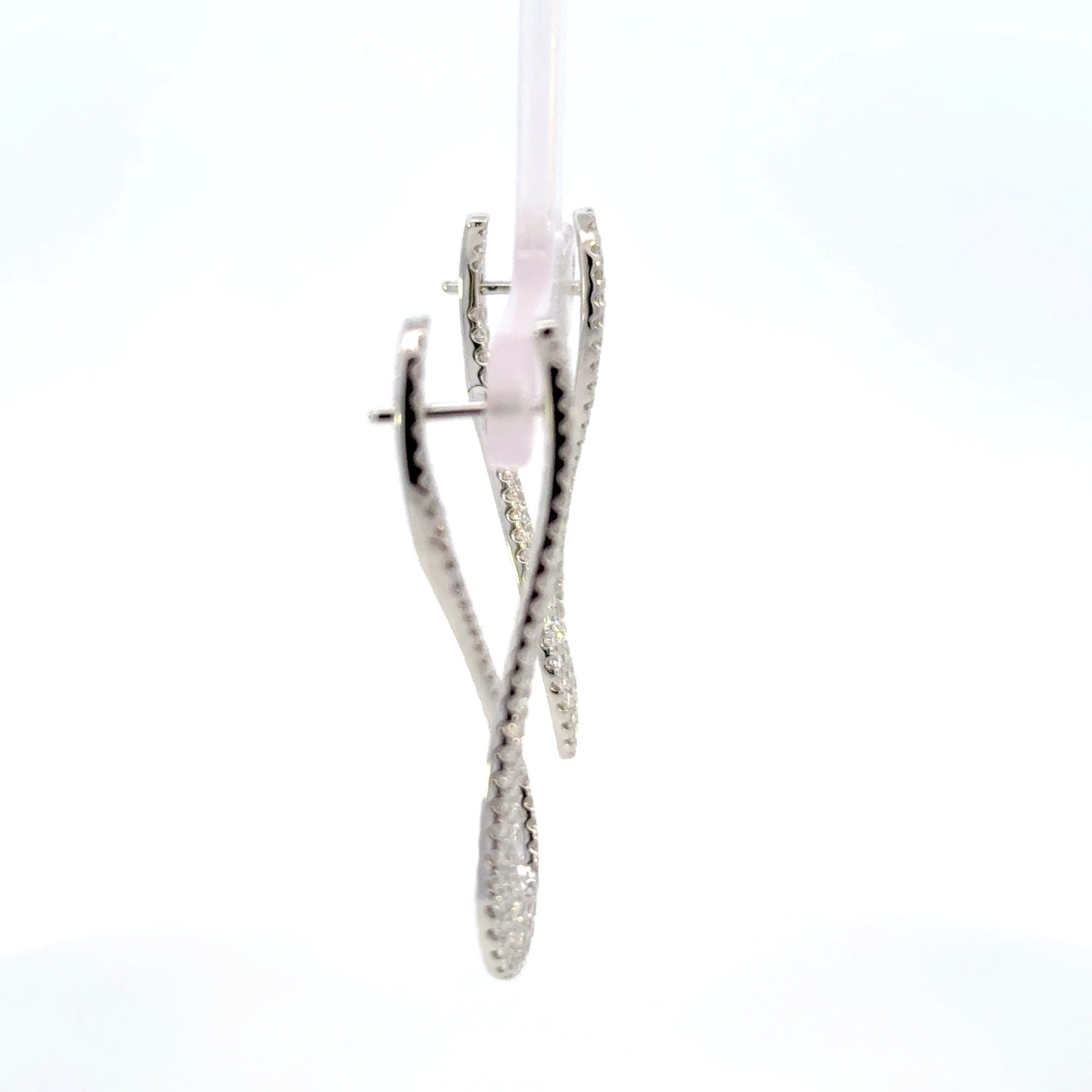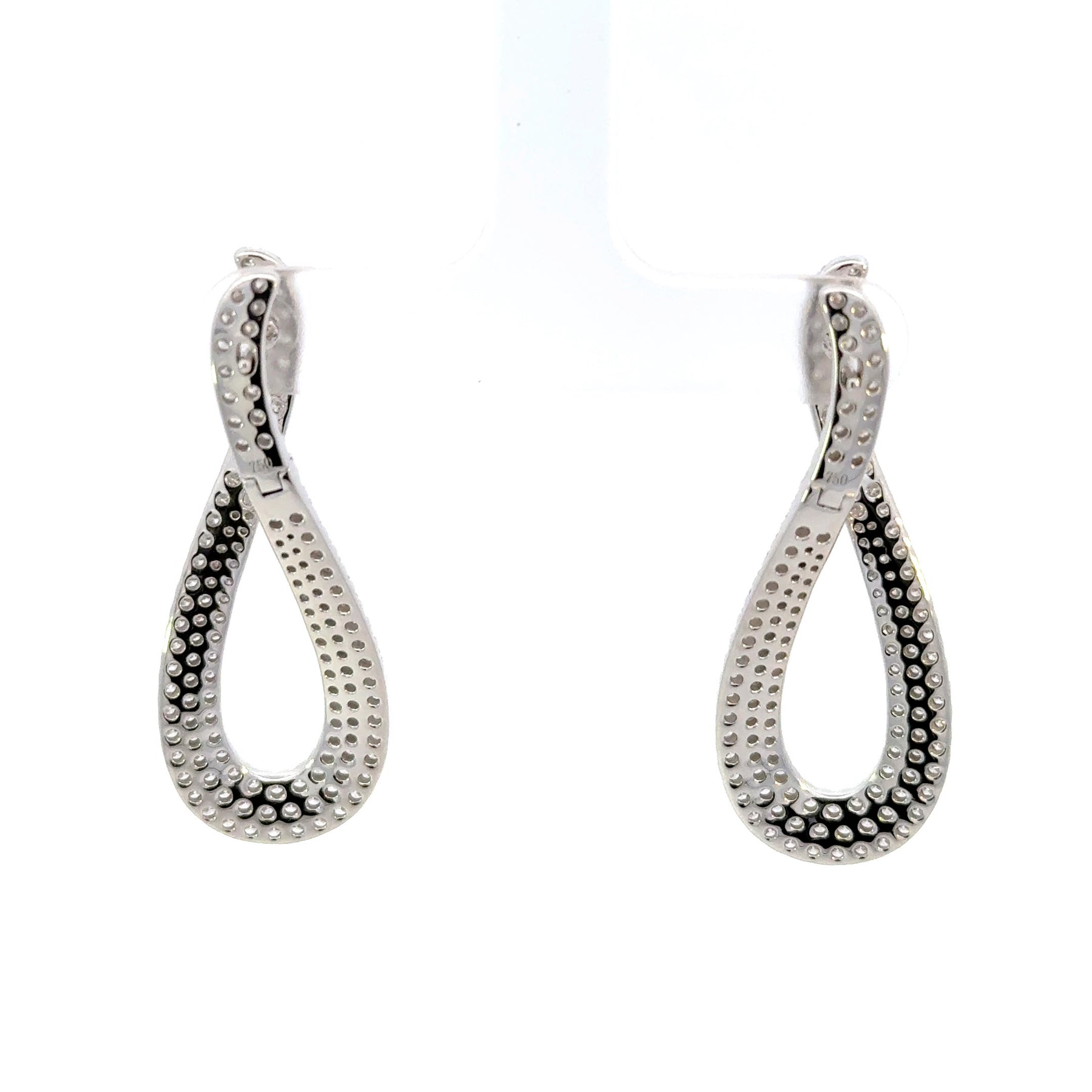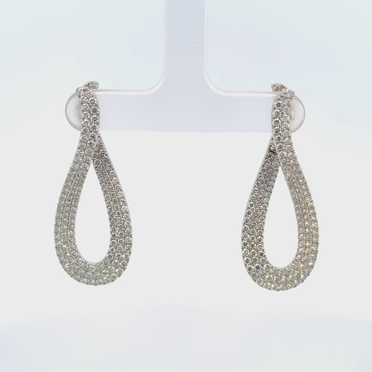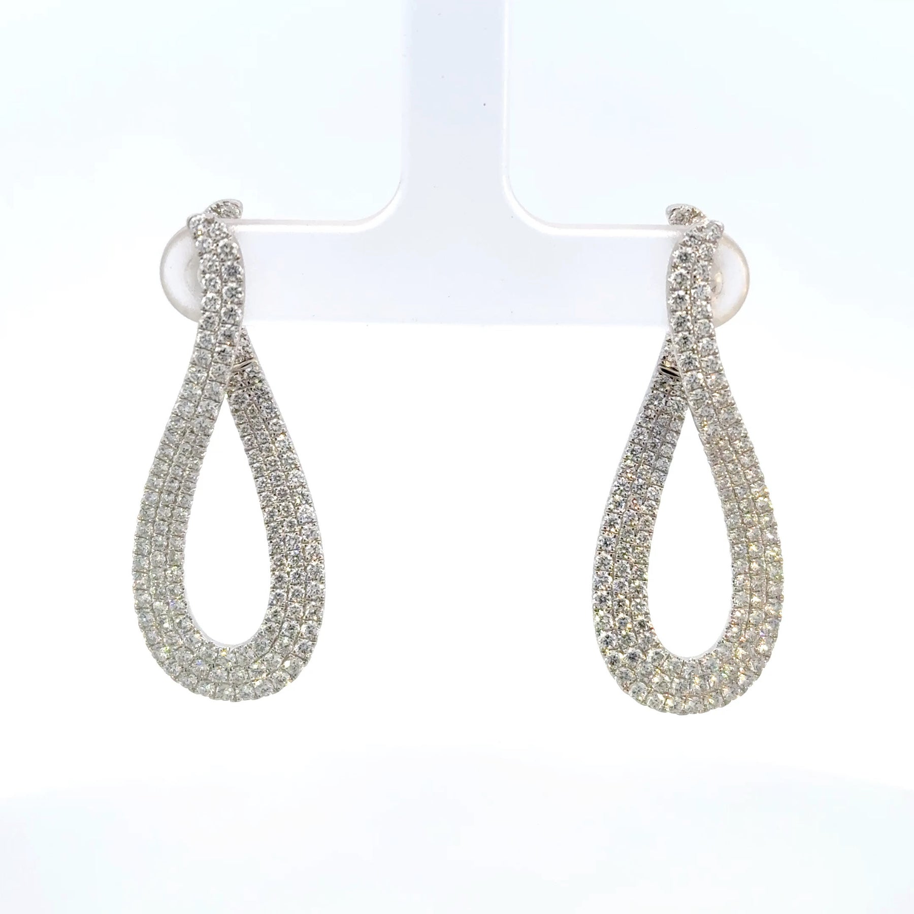 Elevate your style with these stunning dangle earrings. Crafted in fine white gold over silver, they feature round brilliant cut diamonds that catch the light with every movement. The unique teardrop design ensures these earrings will be a cherished addition to any jewelry collection, perfect for adding a touch of glamour to any occasion. 2.90 total weight round Diamond 18 karat white gold 2.90 total diamond weight