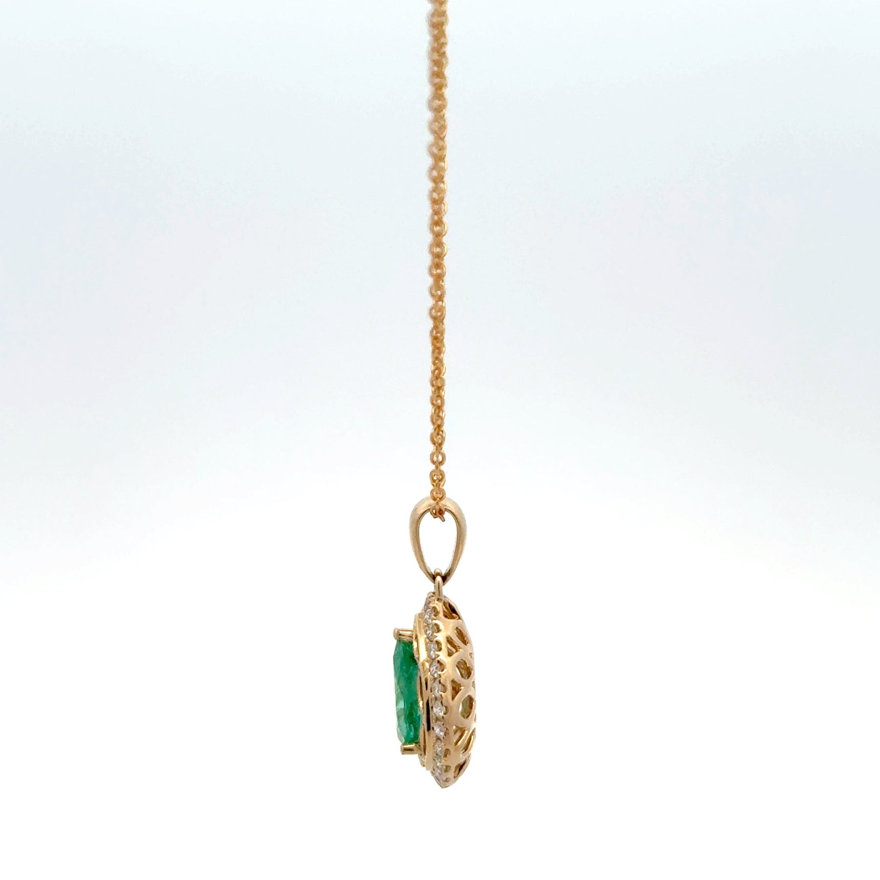 Elevate your style with this exquisite gold Pendant necklace featuring a captivating pear-shaped cabochon-cut emerald. The vibrant green gemstone exudes sophistication and charm, making this necklace a timeless addition to any jewelry collection. 1.25 total weight pear Emerald 14 karat yellow gold 0.21 total diamond weight