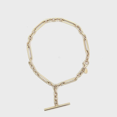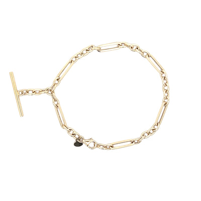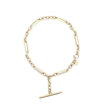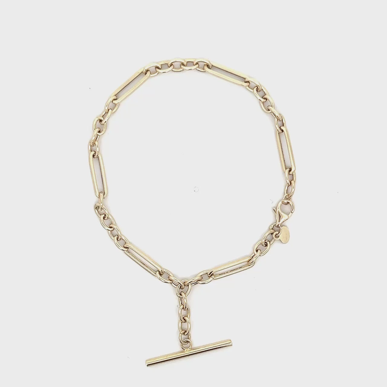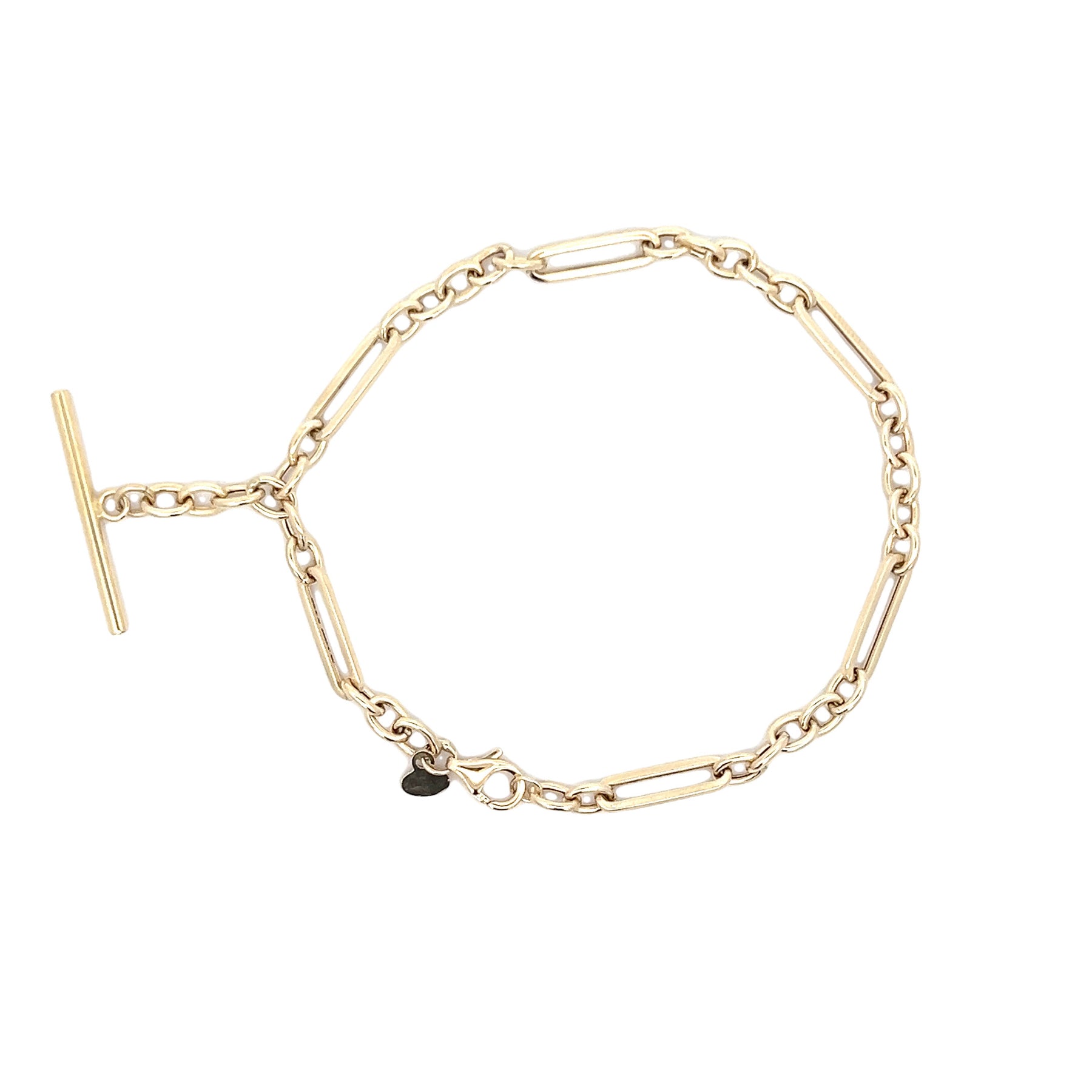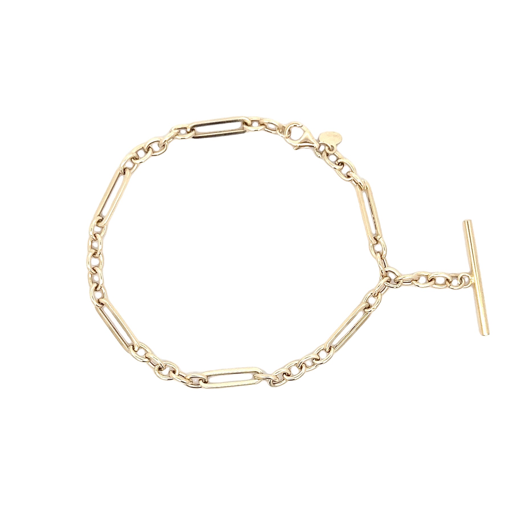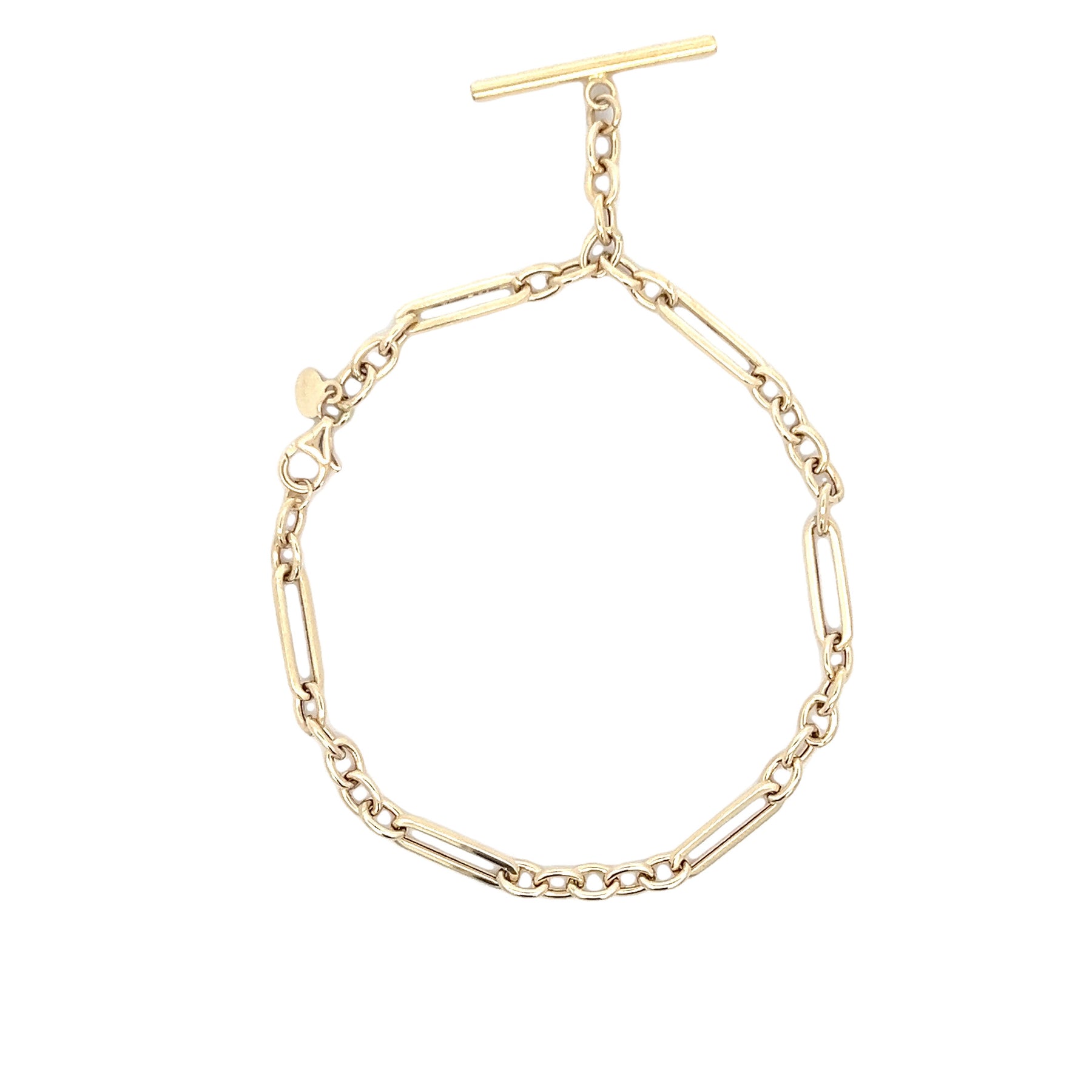 This stunning gold chain bracelet is the perfect accessory for any occasion. Its unique design features elongated links that create a modern yet timeless look. Whether you're dressing up for a night out or adding a touch of elegance to your everyday outfit, this bracelet is sure to turn heads. 14 karat yellow gold.