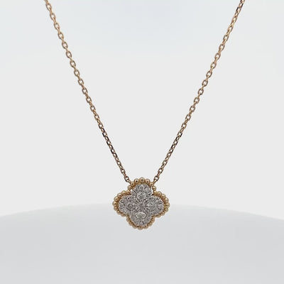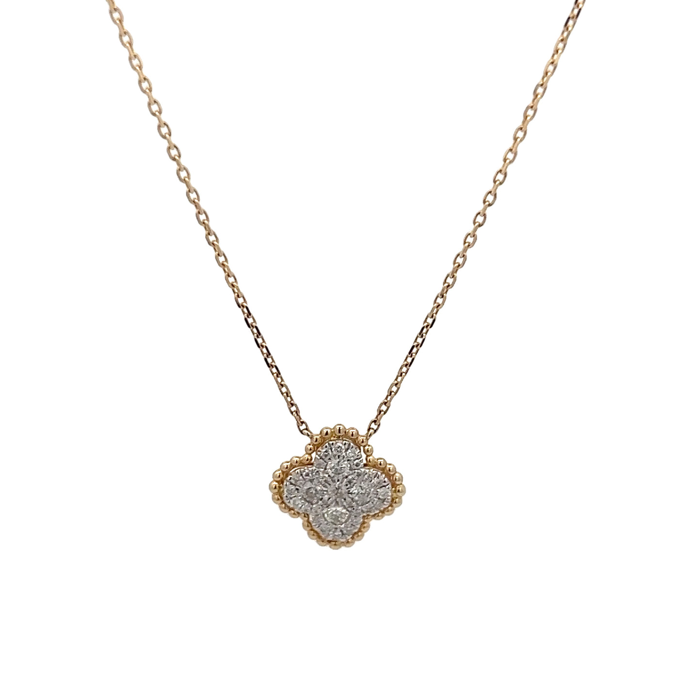 Discover the timeless elegance of this gold pendant necklace, featuring a beautifully crafted floral design adorned with sparkling gemstones. Perfect for any occasion, this piece adds a touch of sophistication to your outfit, making it an essential addition to your jewelry collection. 0.35 total weight Round diamond 14 karat yellow gold Two tone 0.35 total diamond weight.