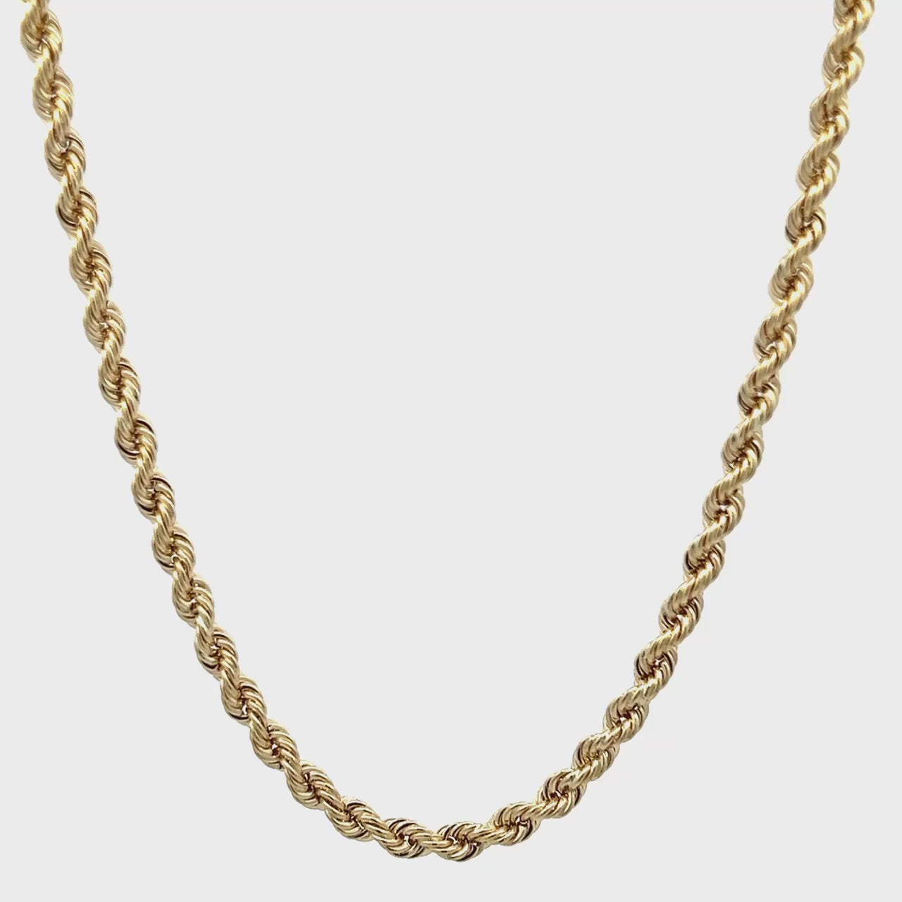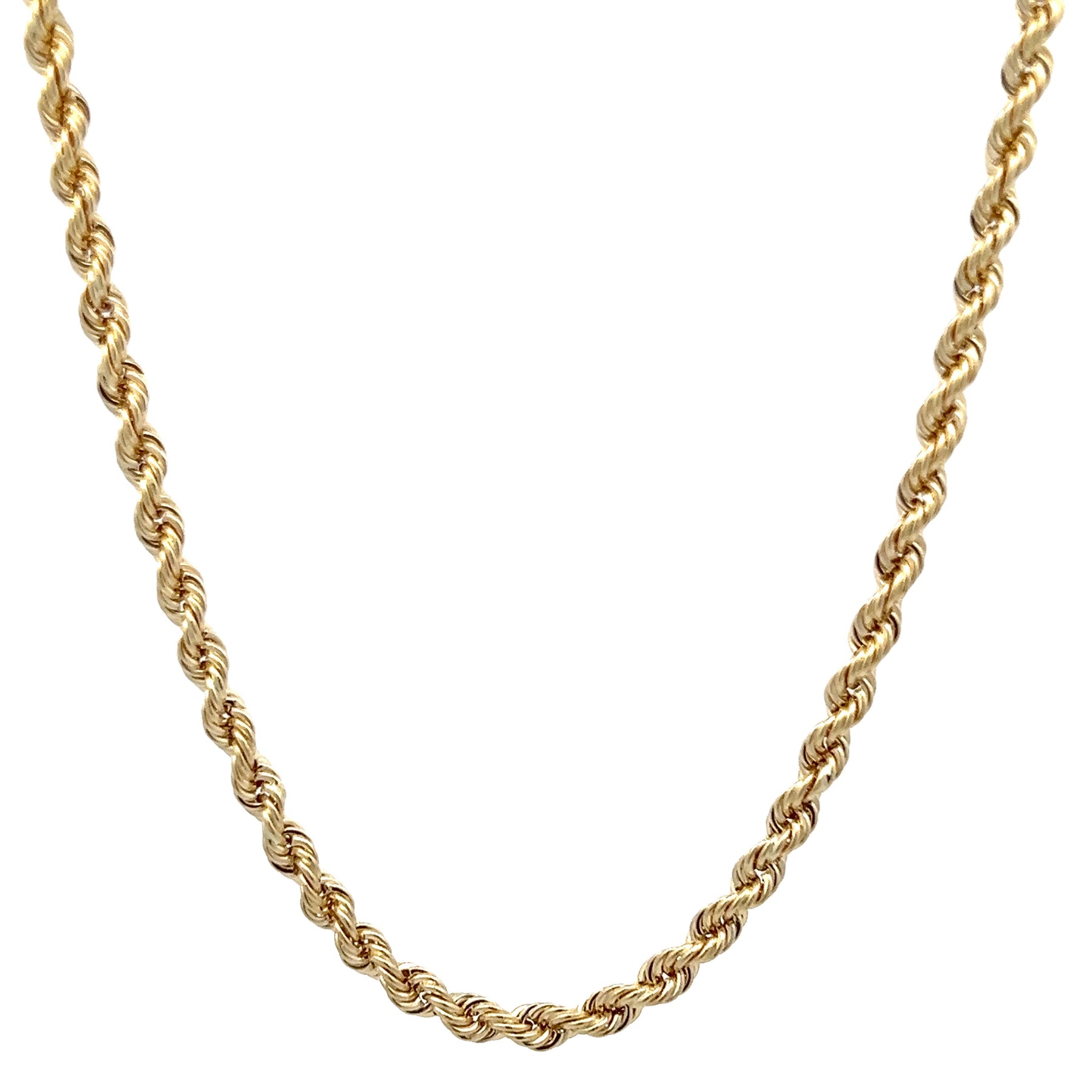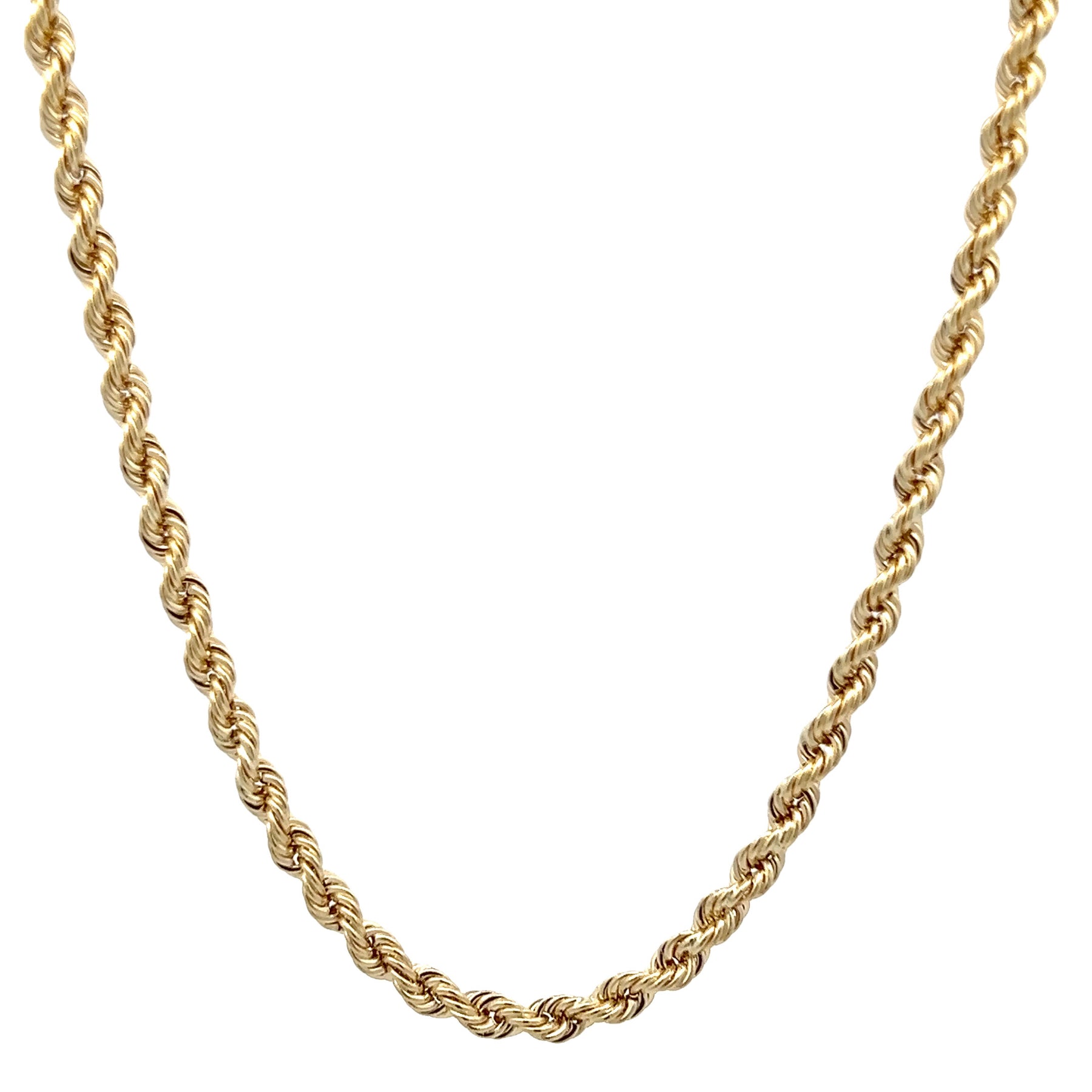 This stunning gold rope chain necklace exudes elegance and sophistication. Its intricate twisted design catches the light beautifully, making it a perfect accessory for any occasion. Whether worn alone or layered with other pieces, this necklace is sure to elevate your style. 14 karat yellow gold