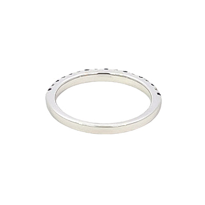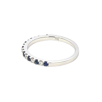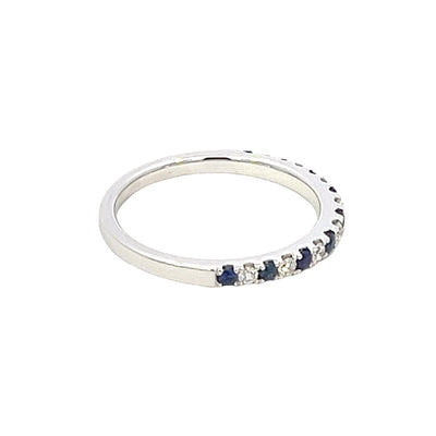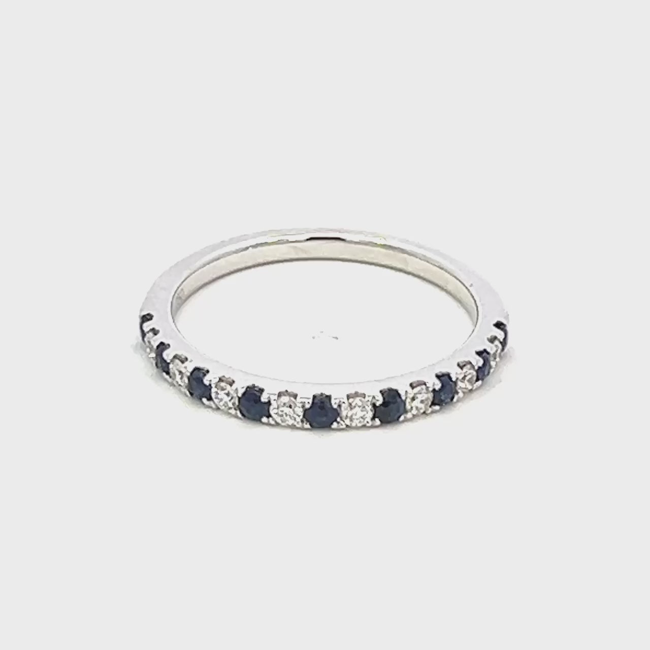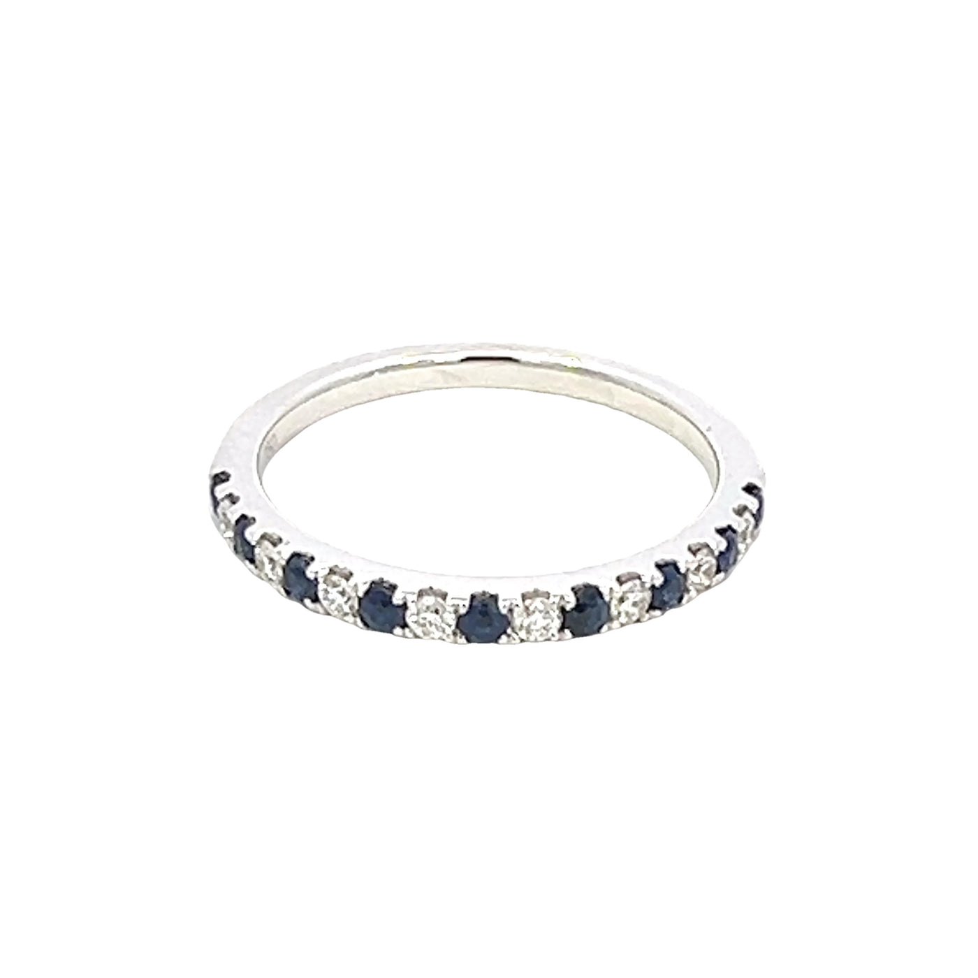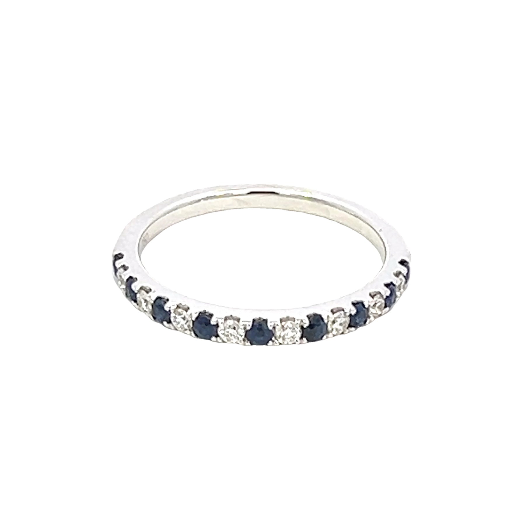 Discover the timeless beauty of this elegant sapphire and diamond ring. Crafted with precision, it features a stunning arrangement of deep blue sapphires interspersed with sparkling diamonds, creating a captivating contrast. Perfect for special occasions or as a cherished everyday accessory, this ring embodies sophistication and style. 0.25 total weight Round Sapphire.18 karat white gold 0.16 total diamond weight.