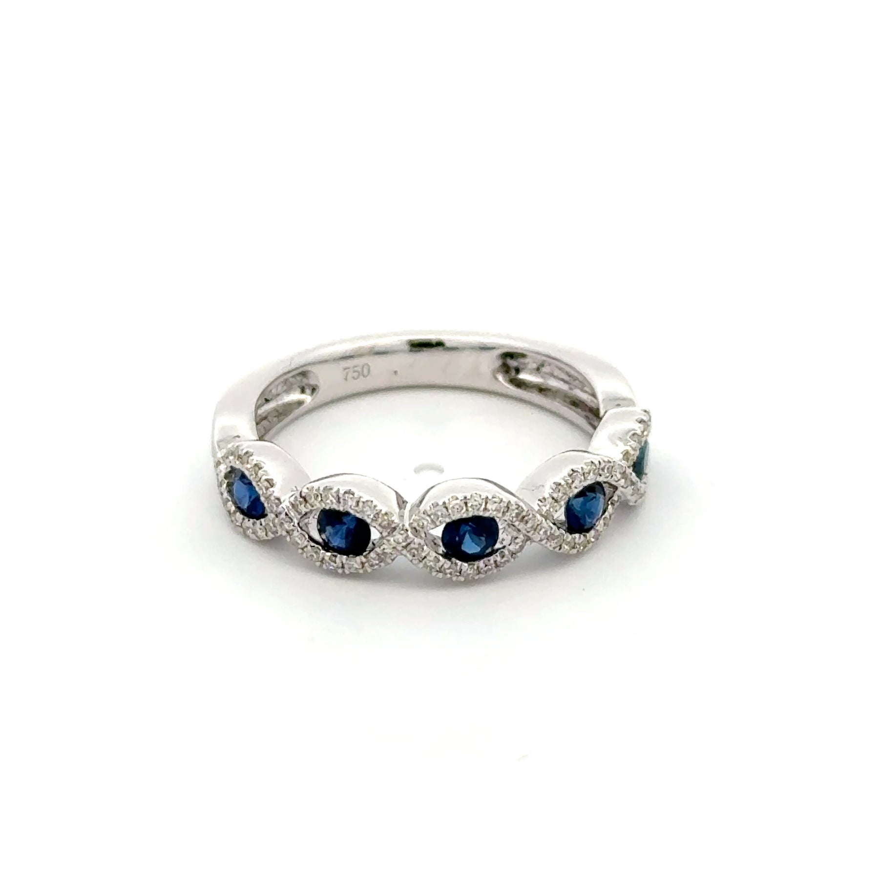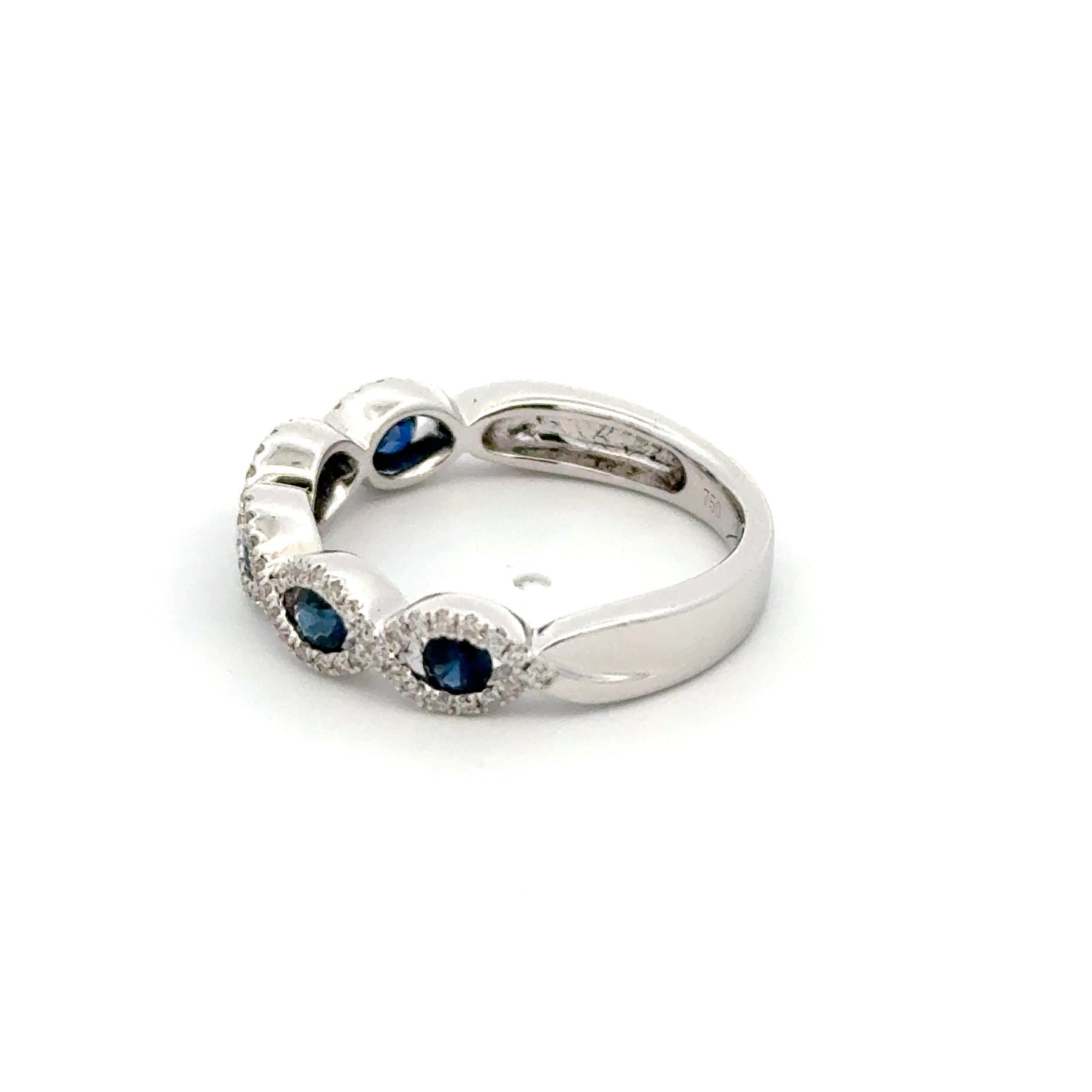 Indulge in the timeless elegance of this exquisite white gold multi stone ring. The ring features captivating oval-shaped cabochon sapphires with a deep blue hue, their vivid color adding a touch of sophistication to any ensemble. Expertly crafted, this ring showcases impeccable symmetry, a good cut grade, VS clarity, and a high-quality polish, making it a treasured addition to your jewelry collection.0.53 total weight round sapphire 18 karat white gold 0.18 total diamond weight