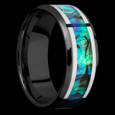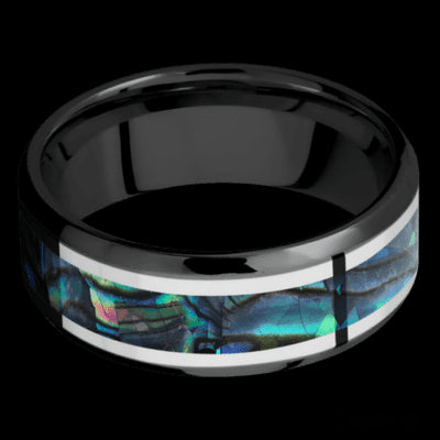8 mm wide/Beveled/Zirconium band featuring inlays of Palladium Silver and Abalone.