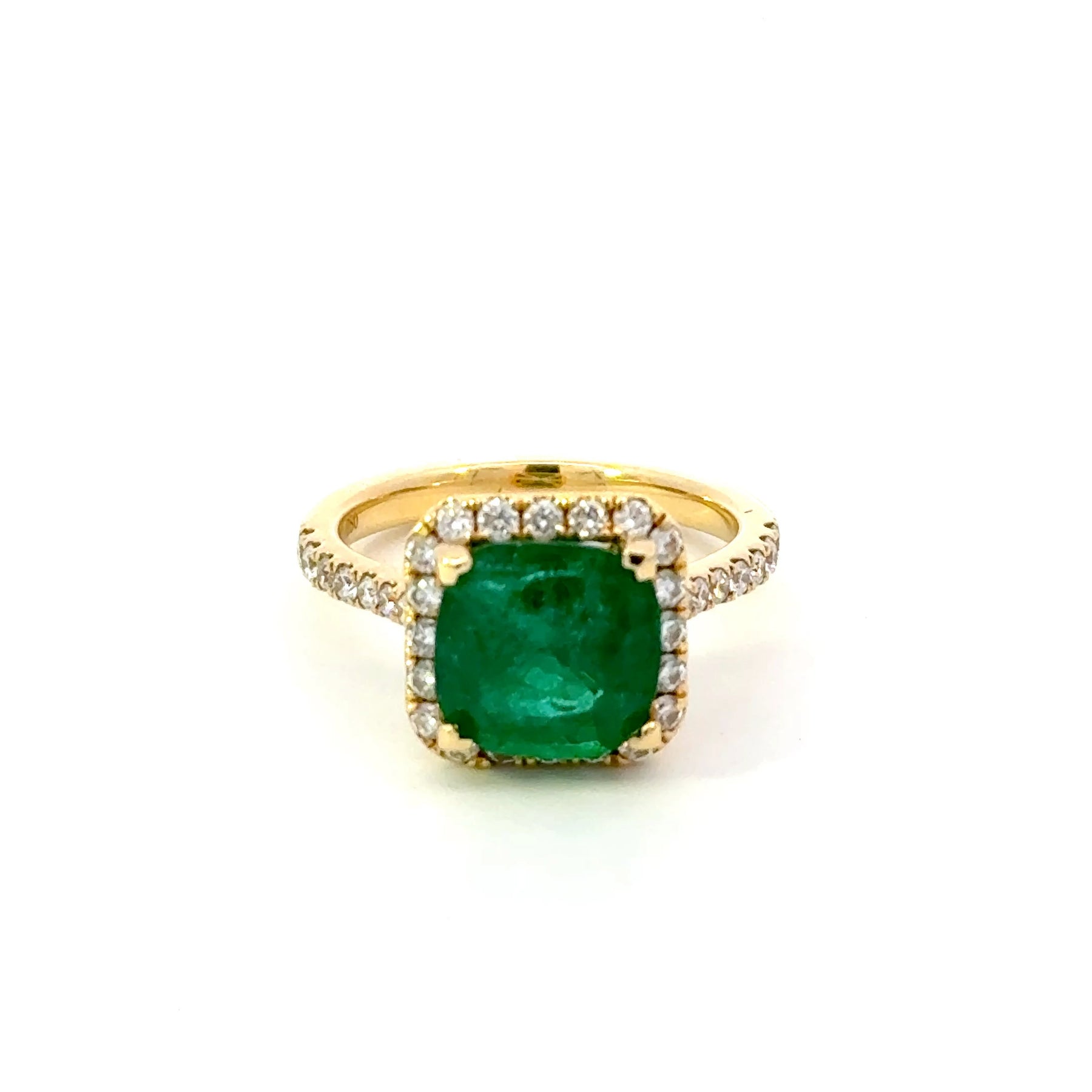 Discover the exquisite beauty of this emerald and diamond ring, a perfect blend of elegance and sophistication. The stunning emerald centerpiece is surrounded by a halo of sparkling diamonds, making it an ideal choice for special occasions or as a statement piece in your jewelry collection. 18 karat yellow gold 3.10 carats green Emerald 0.58 carat diamonds
