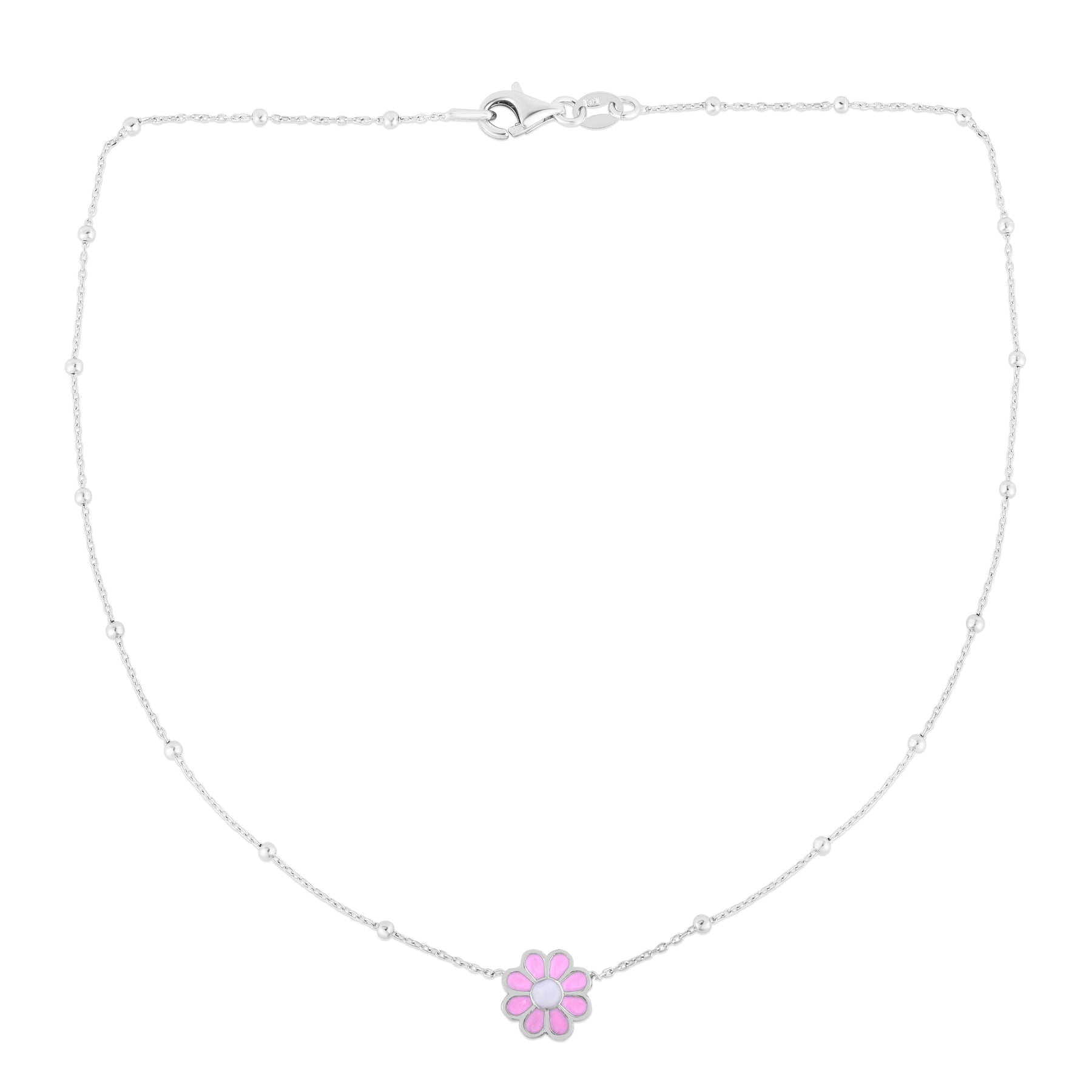 Sterling Silver Polished Enamel Pink Flower Necklace with Lobster Clasp. Total length 16"" includes 2"" extender.