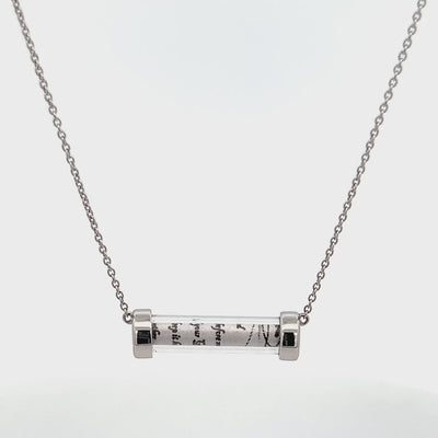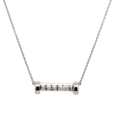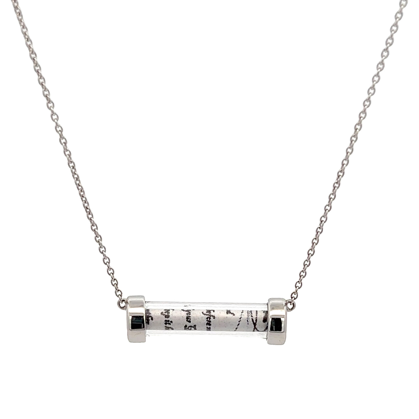 Discover the beauty of this elegant White Gold pendant, featuring a unique design that showcases a delicate scroll of handwritten text encased in a transparent tube. This piece is perfect for those who appreciate artistry and individuality in their jewelry collection.